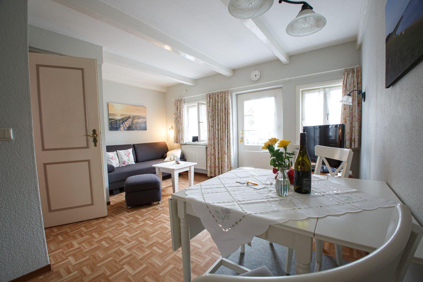 Das Apartment befindet sich im Erdgeschoss und ist dank ebenerdiger Bauweise bequem zugänglich. Die offene Küche, ausgestattet mit einem modernen Cerankochfeld, Backofen, Kühlschrank mit Eisfach, Spülmaschine, Kaffeemaschine, Toaster, Wasserkocher und umfangreichem Küchenzubehör, ist in das lichtdurchflutete Wohnzimmer integriert. Am Esstisch nehmen Sie Ihre Mahlzeiten mit Blick auf den Garten oder in geselliger Runde Platz. Ein komfortables Sofa und ein Sessel laden zum Entspannen ein. Zur medialen Ausstattung gehören ein Satelliten-TV (25-34 Zoll), Radio und CD-Spieler. Für einen angenehmen Aufenthalt sorgt, neben einer zuverlässigen zentralen Heizung, das kostenfreie WLAN mit einer Geschwindigkeit ab 25 MBit/s (z.B. VDSL).