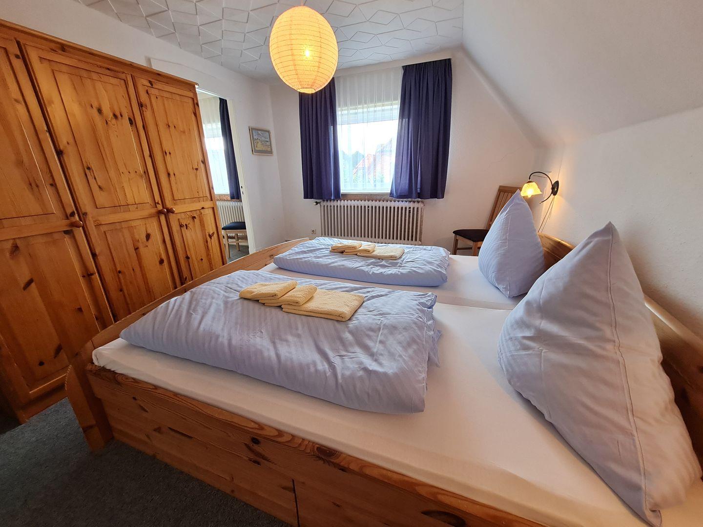 Im Obergeschoss (ca. 45 m2) befinden sich 3 Schlafzimmer (davon ein Durchgangszimmer zum Kinderzimmer) mit insgesamt sechs Betten (1x Boxspringbett, 1x Doppelbett, 2x Einzelbett), sowie ein weiteres geräumiges tageslicht Badezimmer mit Dusche, Föhn, WC und einem Waschbecken. Ein Kinderreisebett ist ebenfalls vorhanden.