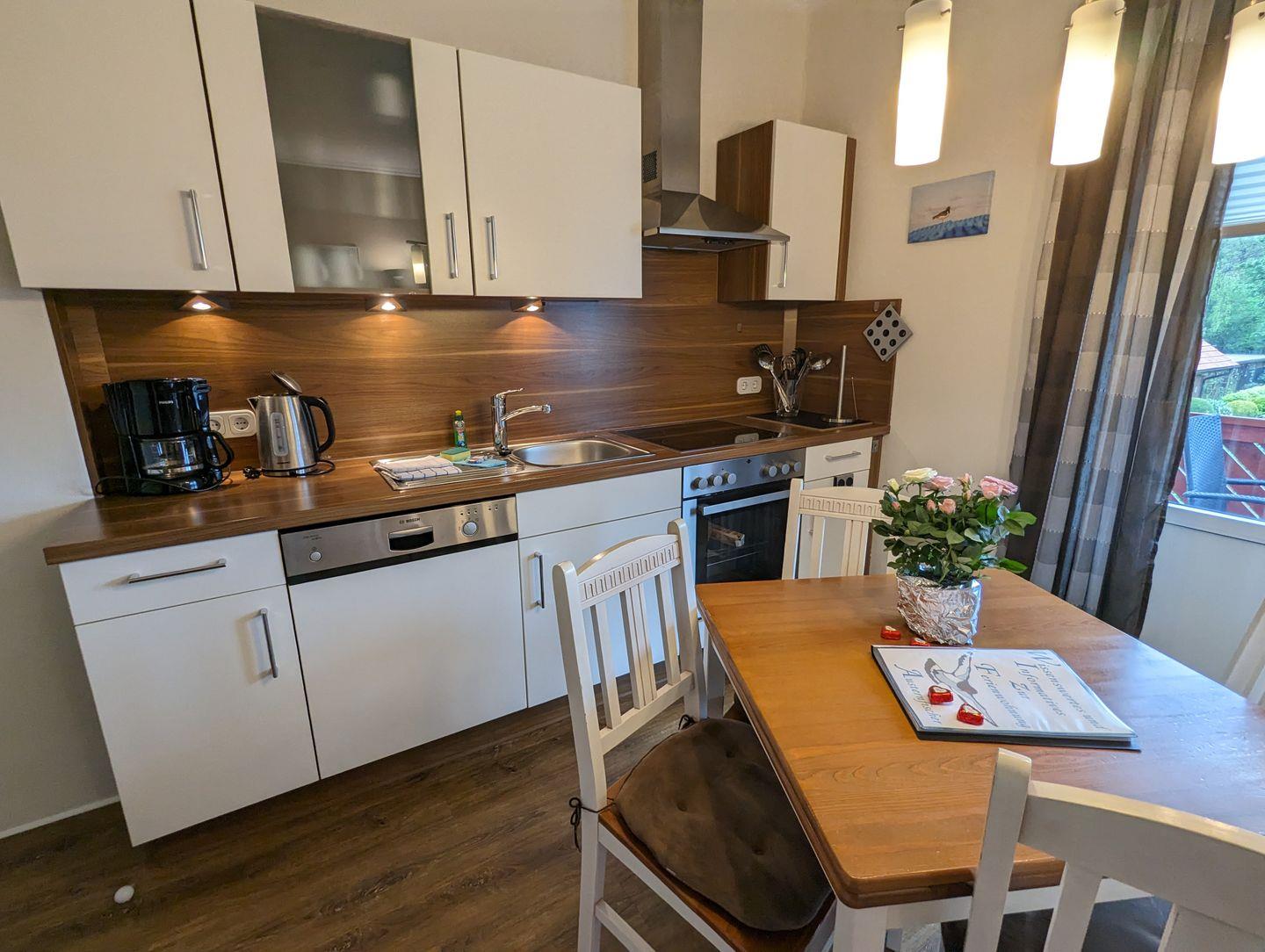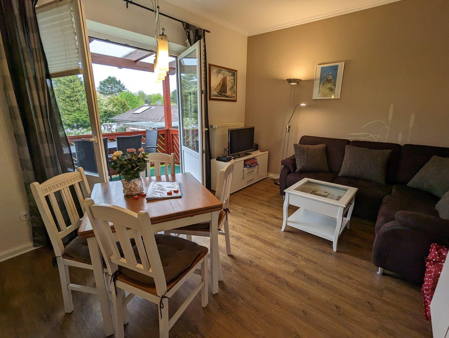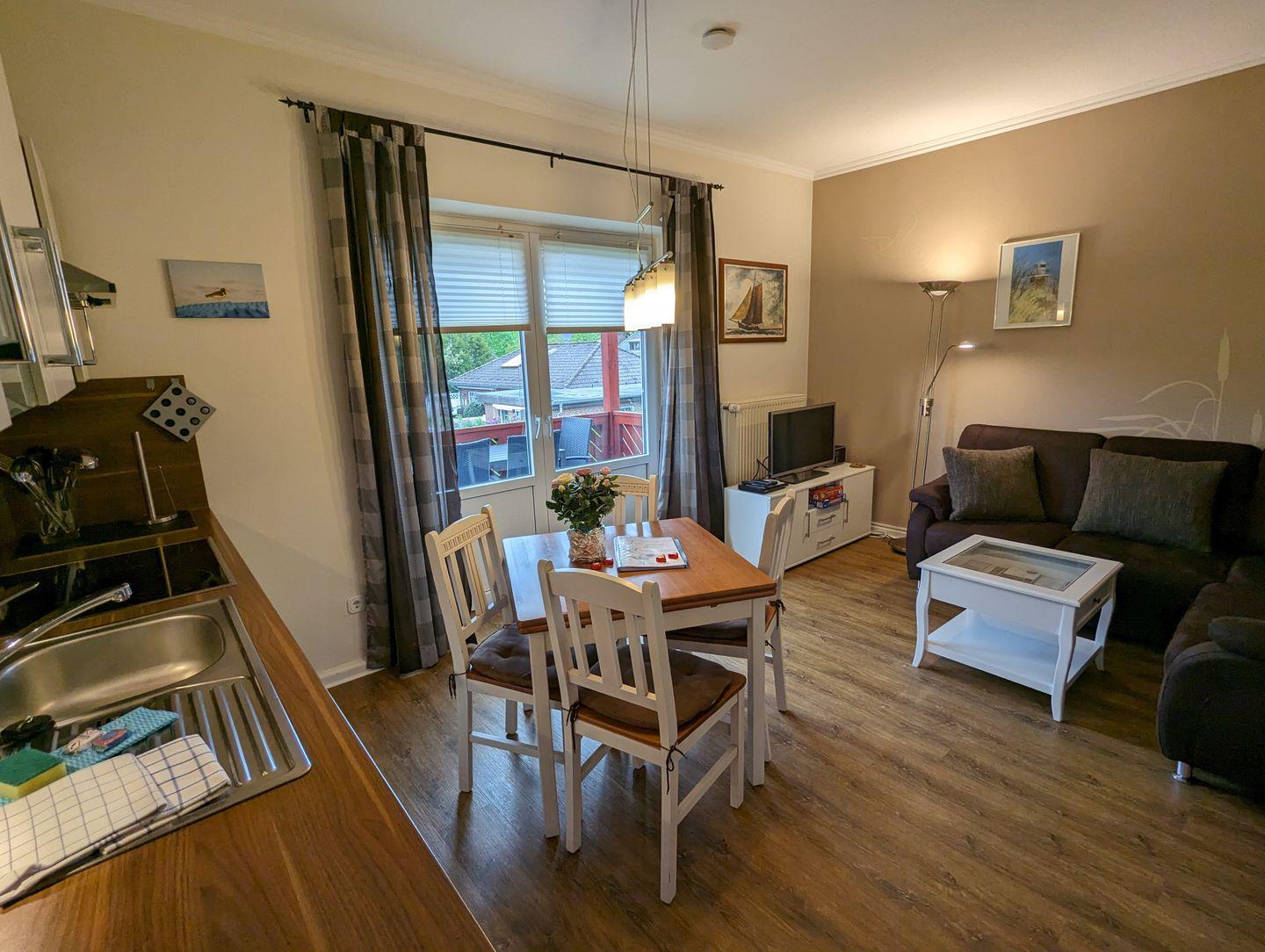 Die Wohnung besitzt neben der Wohnküche mit einer integrierten Einbauküche und Esstisch, zwei Schlafzimmer, ein Duschbad mit Tageslicht und einen Süd-West-Balkon mit Gartenblick, Gartenmöbeln und einem Elektro-Grill. Die Ferienwohnung verfügt über einen WLAN-Anschluss, SAT-TV, DVD-Player und eine Stereoanlage.