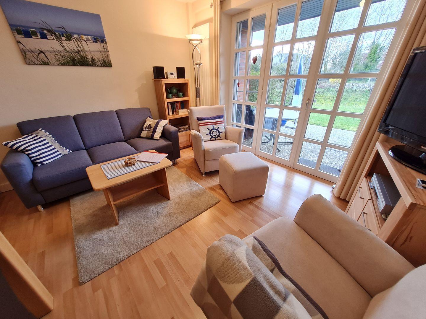 Das Kinder- und Allergikerfreundliche und modern eingerichtete Reihenmittelhaus mit zwei Schlafzimmern ist ca. 10 - 15 Minuten Fußweg vom schönen Südstrand, dem Zentrum von Wyk und dem Wellenbad mit Kuranwendungen entfernt. Es erstreckt sich über 2 Etagen und verfügt im EG über ein Wohnzimmer (Kabel-TV, Internet-Radio, Sofa, 2 Sessel) mit Essplatz und Küche, ein WC mit Waschmaschine, Flur und einen Abstellraum, sowie eine West-Terrasse mit Strandkorb und Gartenmöbeln. Im 1.OG befinden sich ein Schlafzimmer (Doppelbett, Kabel-TV, Kleiderschrank), Kinderzimmer mit einem Etagenbett, Einbauschrank, Schreibtisch, Kommode, Spielzeug, Kinderbücher und ein Duschbad mit WC und einem Spiegelschrank. An der Treppe zum Erdgeschoss wurde ein Türgitter angebracht. Alle Räume sind liebe- und geschmackvoll eingerichtet. Ein Kinderreisebett und ein Kinderhochstuhl sind vorhanden. Der umzäunte Spielplatz direkt vor dem Haus kann gemeinschaftlich genutzt werden. Ein PKW-Stellplatz gehört zum Haus genauso wie eine Gartenhütte in der Sie Ihre Fahrräder o.ä. unterstellen können. WLAN, Telefon (nur deutsches Festnetz) und eine Waschmaschine können kostenlos genutzt werden. Tennishalle mit Aussenplätzen, Bolzplatz und Bäcker liegen in unmittelbarer Nachbarschaft. Auch der Golfplatz ist nicht weit vom Haus entfernt. Haustiere und das Rauchen im Haus sind nicht erlaubt.