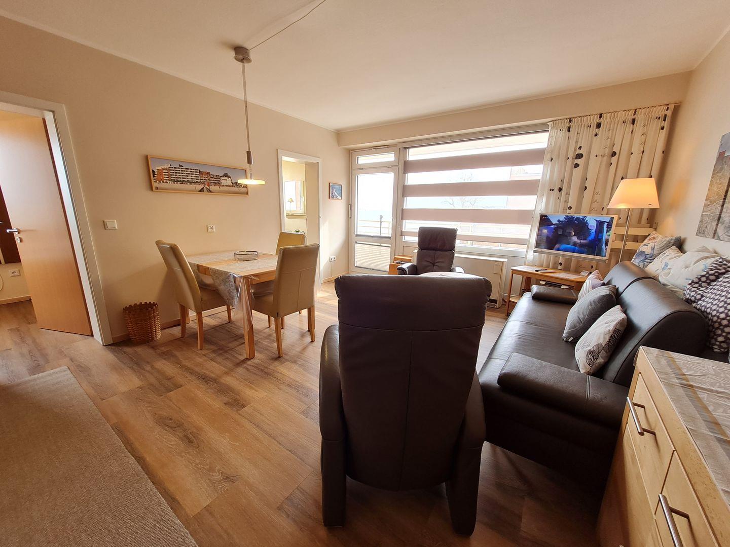 Die Ausstattung ist sehr hochwertig und komfortabel. Im Wohnraum stehen Ihnen ein Esstisch mit drei Lederstühlen, ein Ledersofa und zwei Komfort-Ledersessel, sowie ein Couchtisch zur Verfügung. In der Kommode befinden sich Geschirr, Gläser und eine Spielauswahl. Für Ihre Unterhaltung in der Wohnung sorgen ein TV mit vielen Entertainment Funktionen und 300 Programmen, WLAN, Stereo-Anlage und eine kleine Auswahl an Büchern.