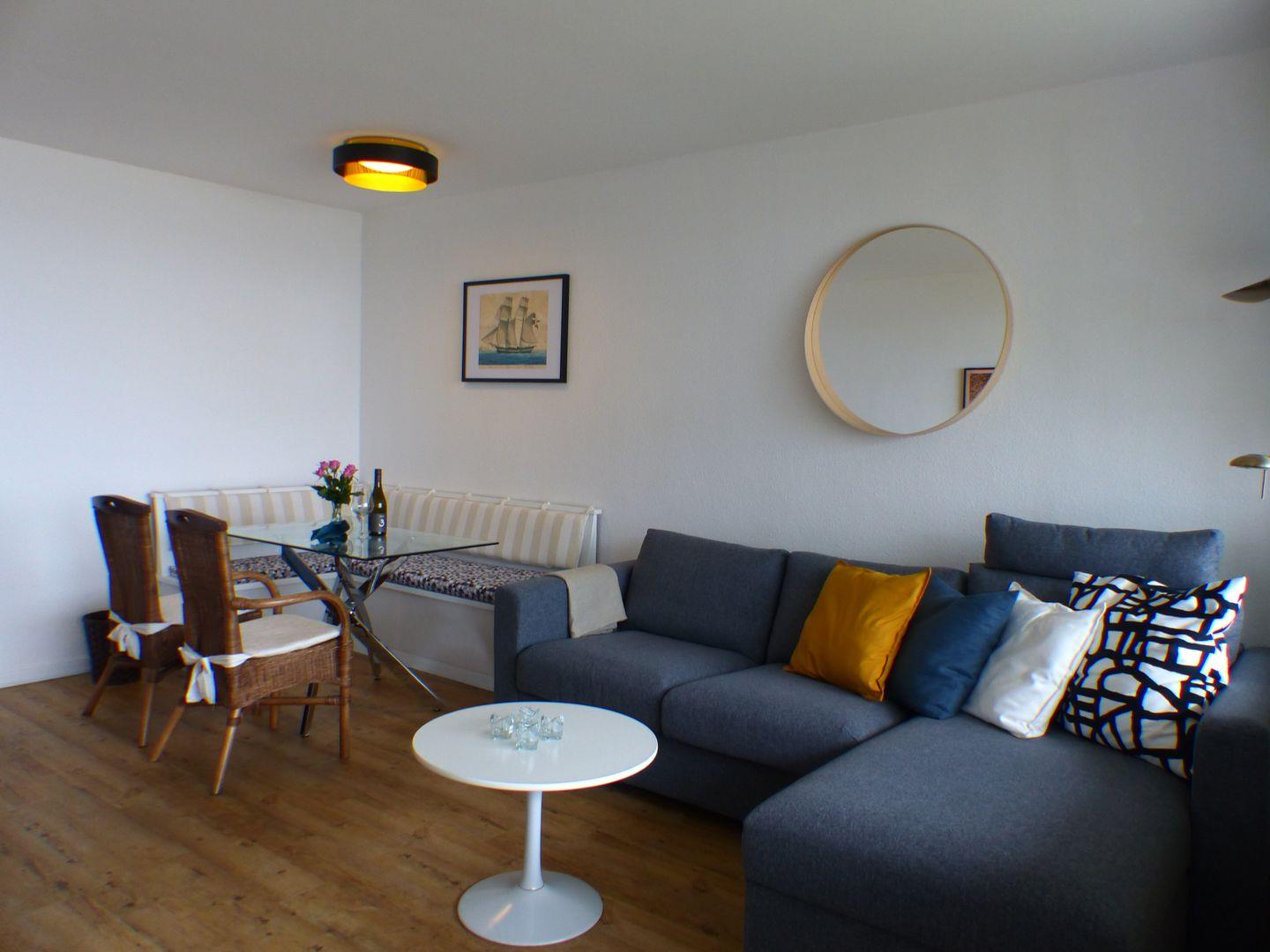 Die Wohnung verfügt über zwei komfortable Schlafzimmer, in denen insgesamt vier Personen bequem schlafen können. Das helle Wohnzimmer lädt mit einer gemütlichen Sitzecke und einem Fernseher zum Entspannen ein. Die voll ausgestattete Küche mit Herd, Kühlschrank, Mikrowelle und Geschirr bietet alles, was Sie für die Zubereitung Ihrer Mahlzeiten benötigen. Das Badezimmer ist modern gestaltet und verfügt über eine Dusche.