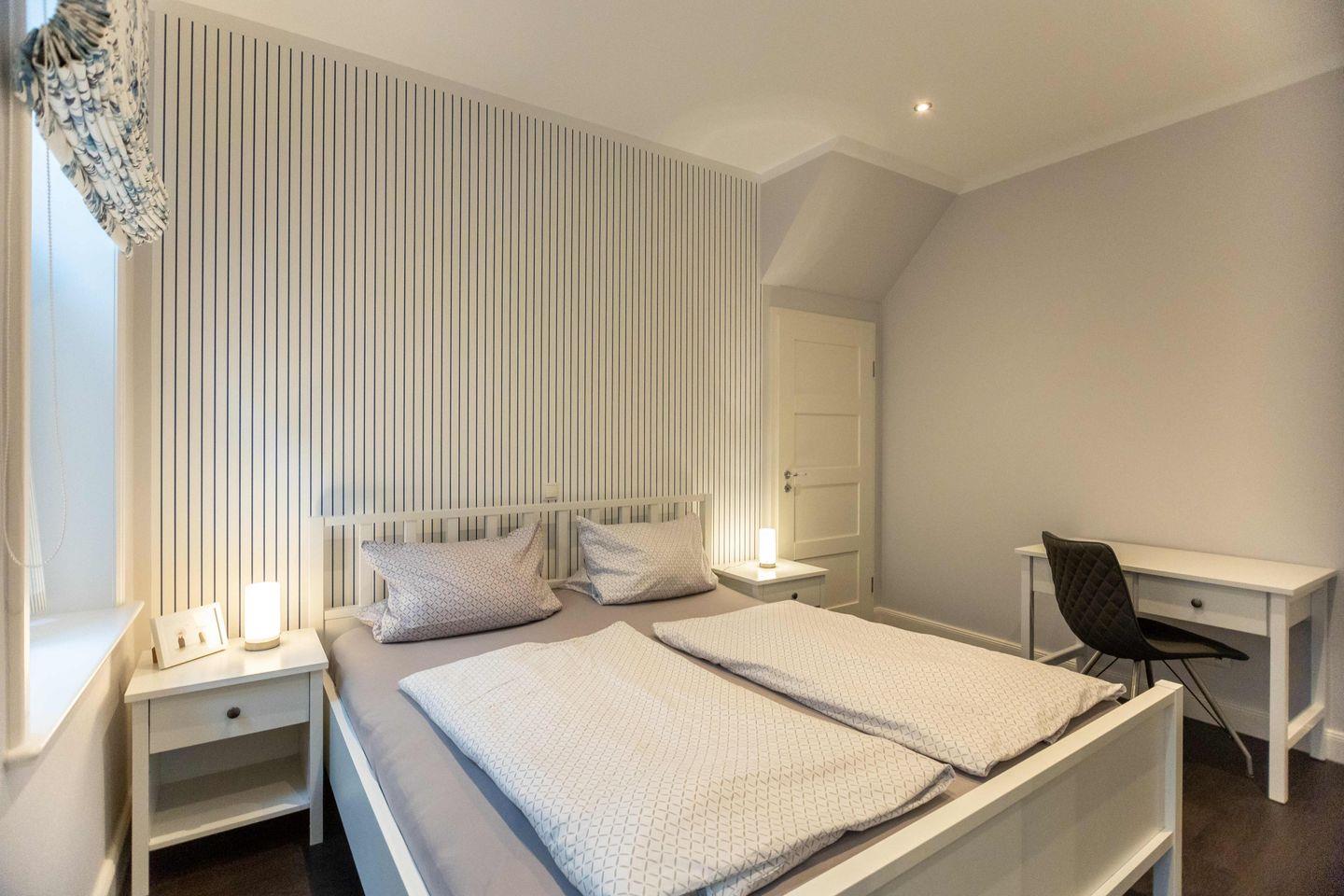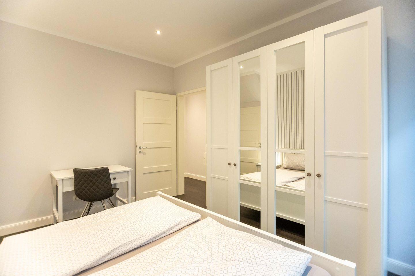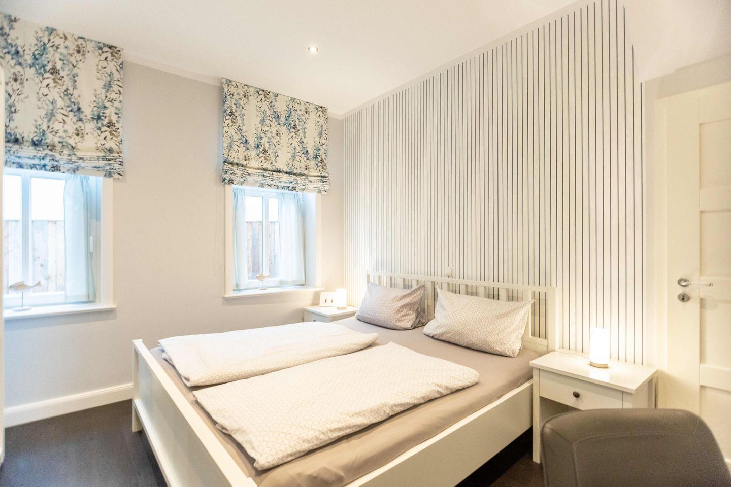 Die großzügigen Schlafzimmer sind jeweils mit einem Doppelbett (180x200), einem geräumigen Kleiderschrank und einer Sitzgelegenheit ausgestattet.