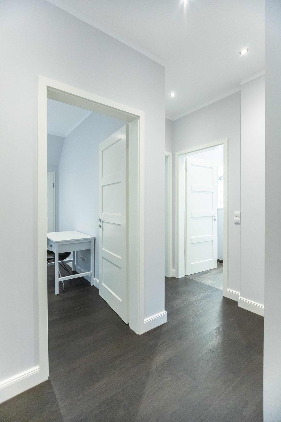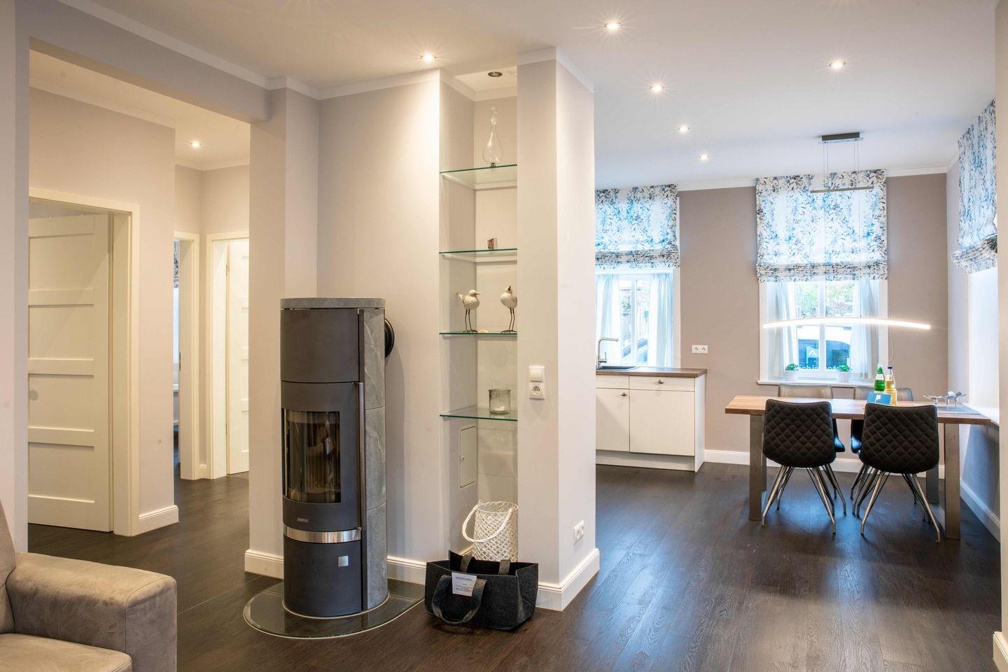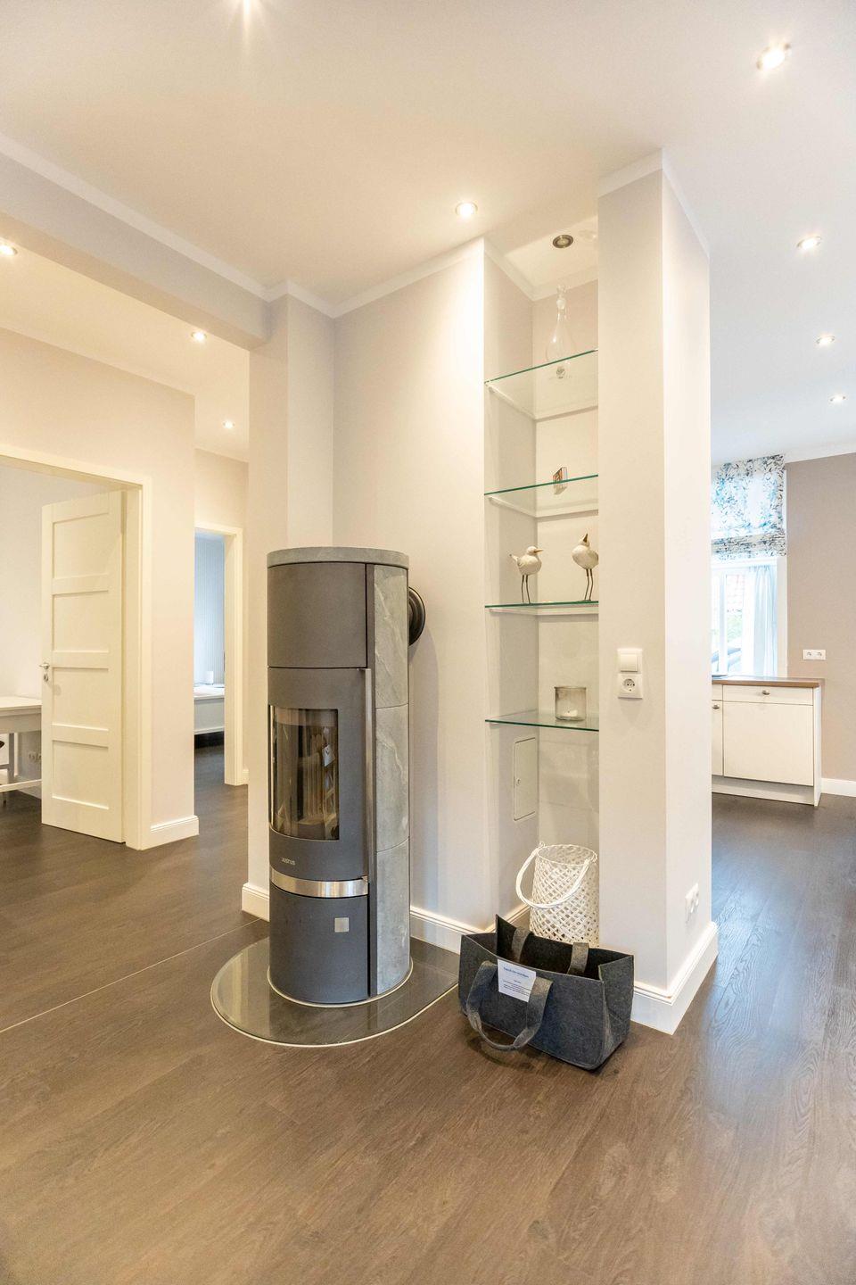 Über den Eingang betreten Sie den Flur der ca. 80 m² großen Wohnung. Hier finden Jacken und Schuhe ausreichend Platz. Vom Flur aus gelangen Sie in den offenen Wohn- und Essbereich mit Küchenzeile. Das Highlight in diesem Raum ist das gläserne Regal neben dem Kamin sowie die beeindruckende Deckenhöhe.