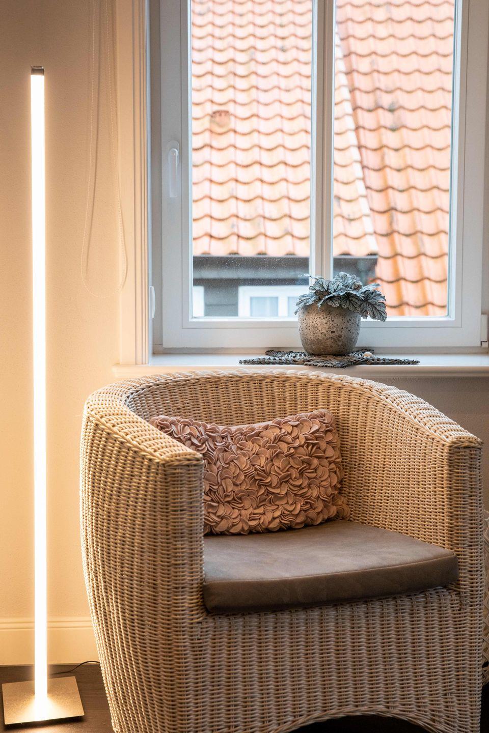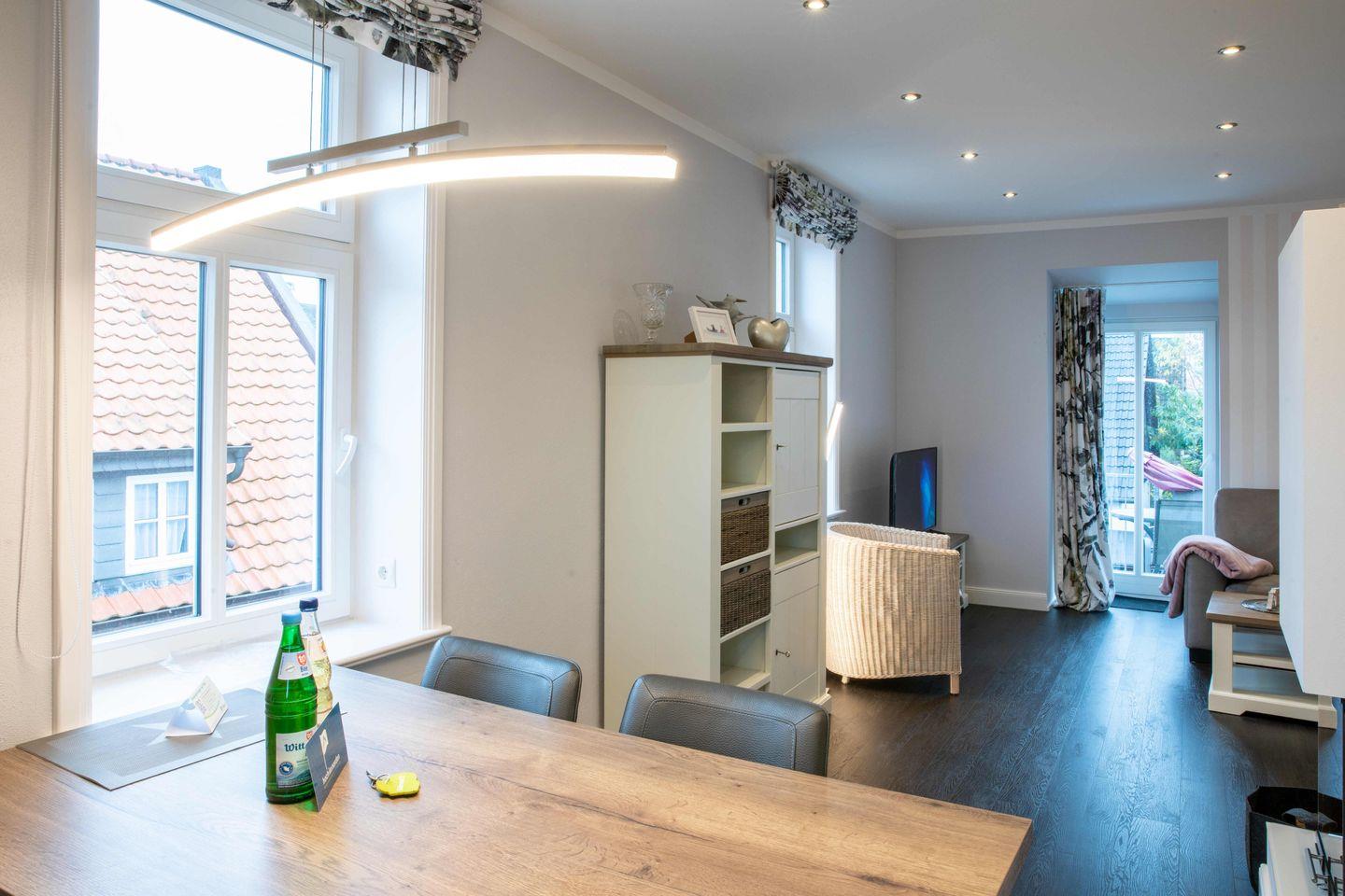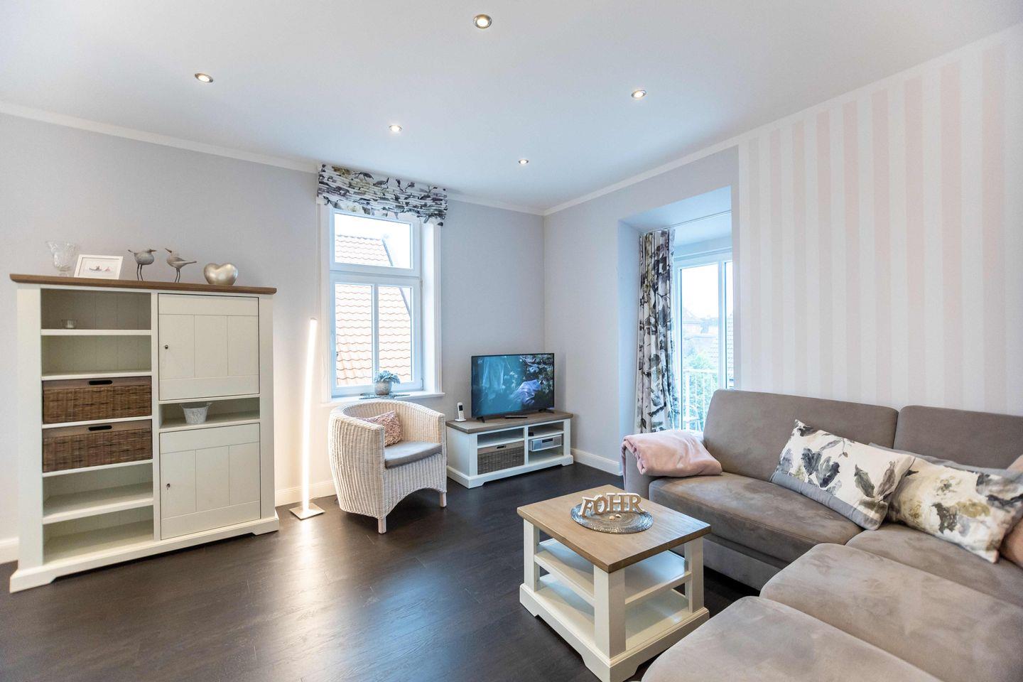 Moderne Ferienwohnung mit Balkon und Strandkorb in Wyks Fußgängerzone, nur wenige Schritte zum Sandstrand und Stadtzentrum.
