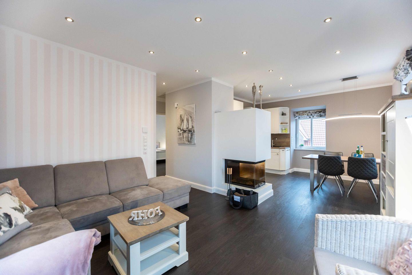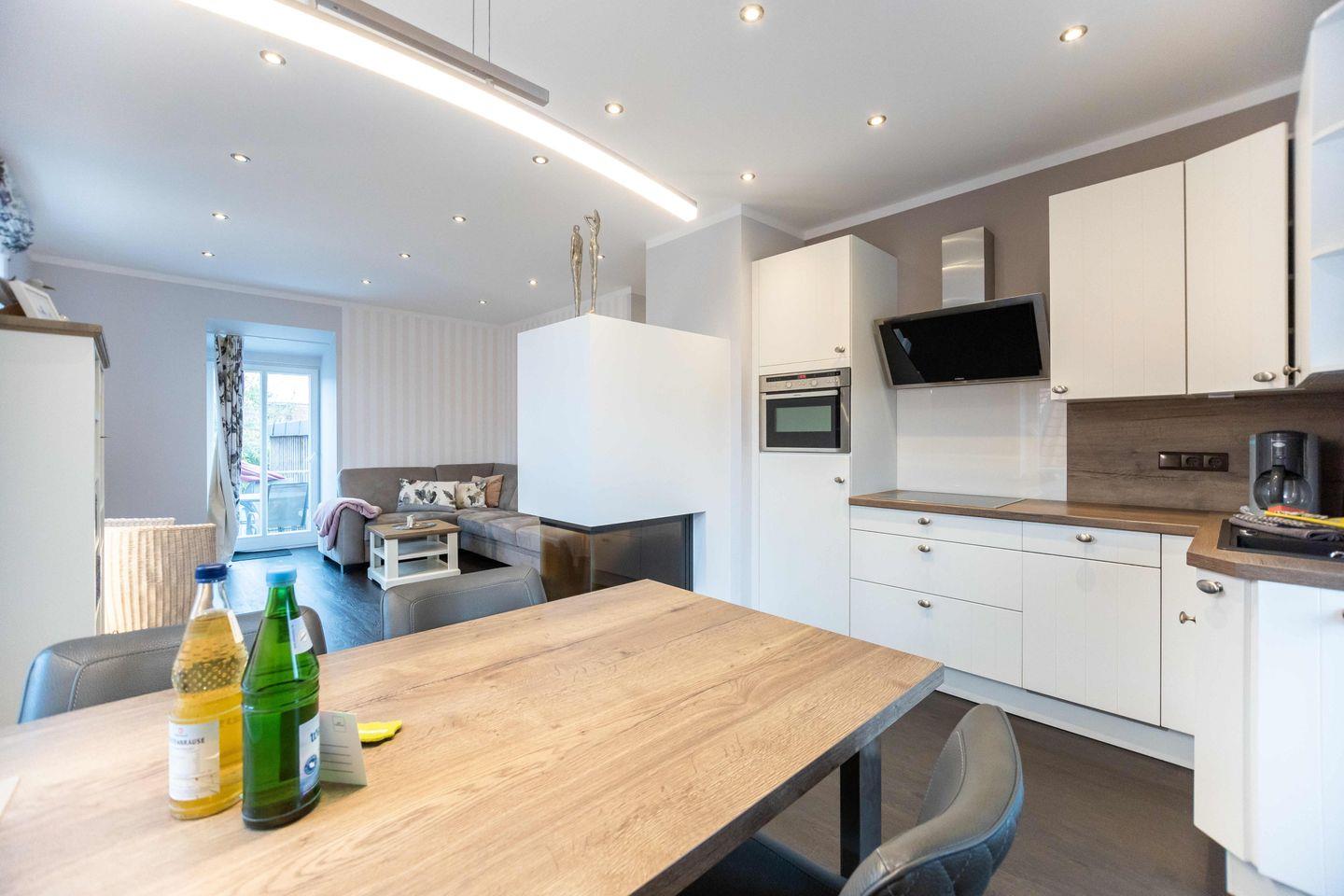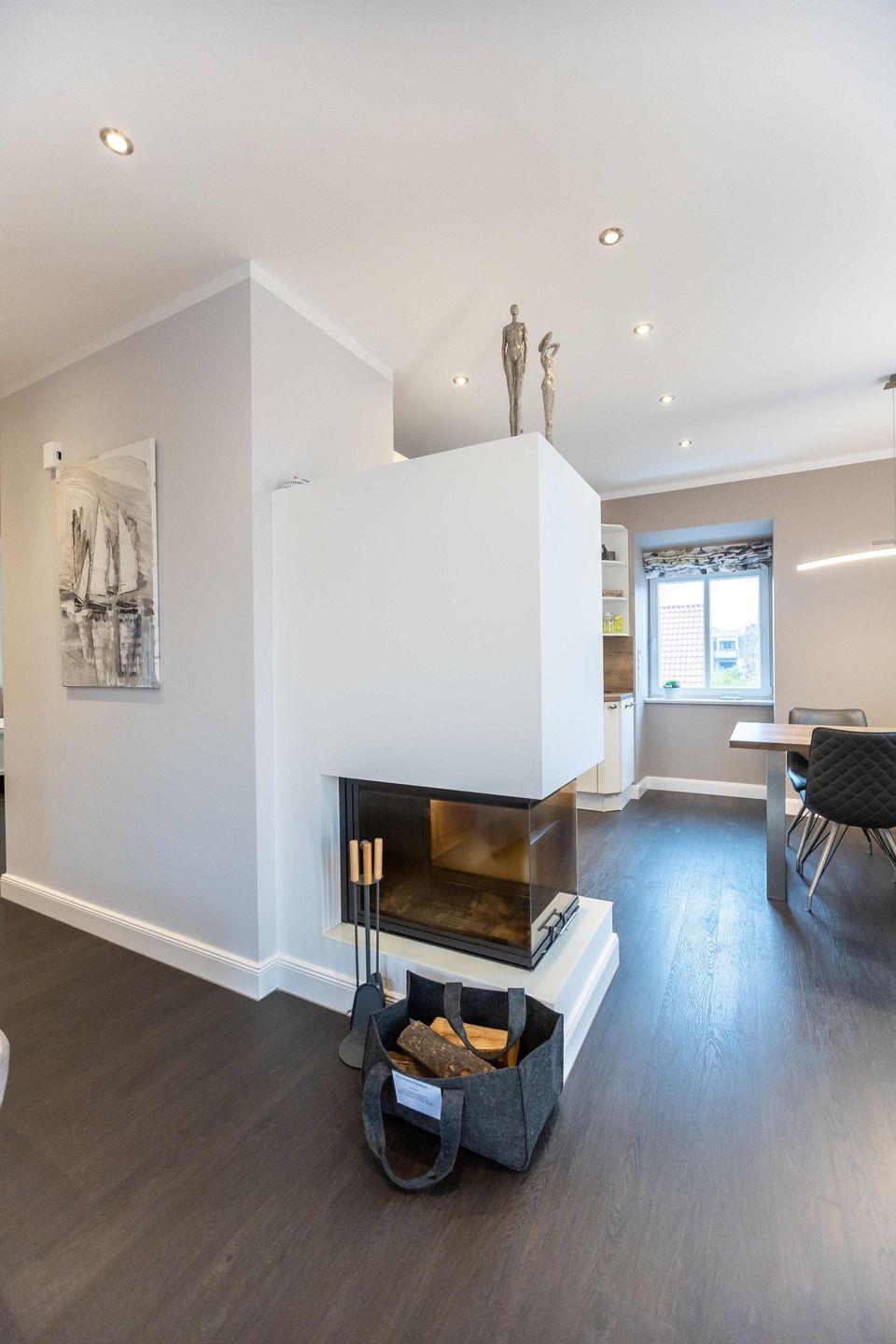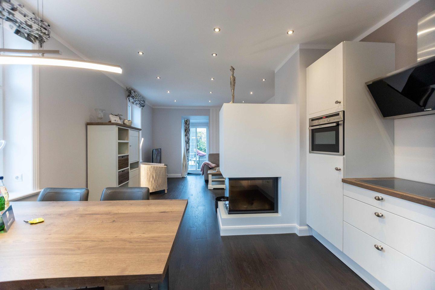 Über den separaten Eingang betreten Sie den Flur der ca. 80 m² großen Wohnung. Hier finden Jacken und Schuhe ausreichend Platz. Vom Flur aus gelangen Sie in den offenen Wohn- und Essbereich mit integrierter Küche. Das Highlight in diesem Raum ist der stilvolle Kamin, der auch an kalten Tagen für eine Wohlfühlatmosphäre sorgt.