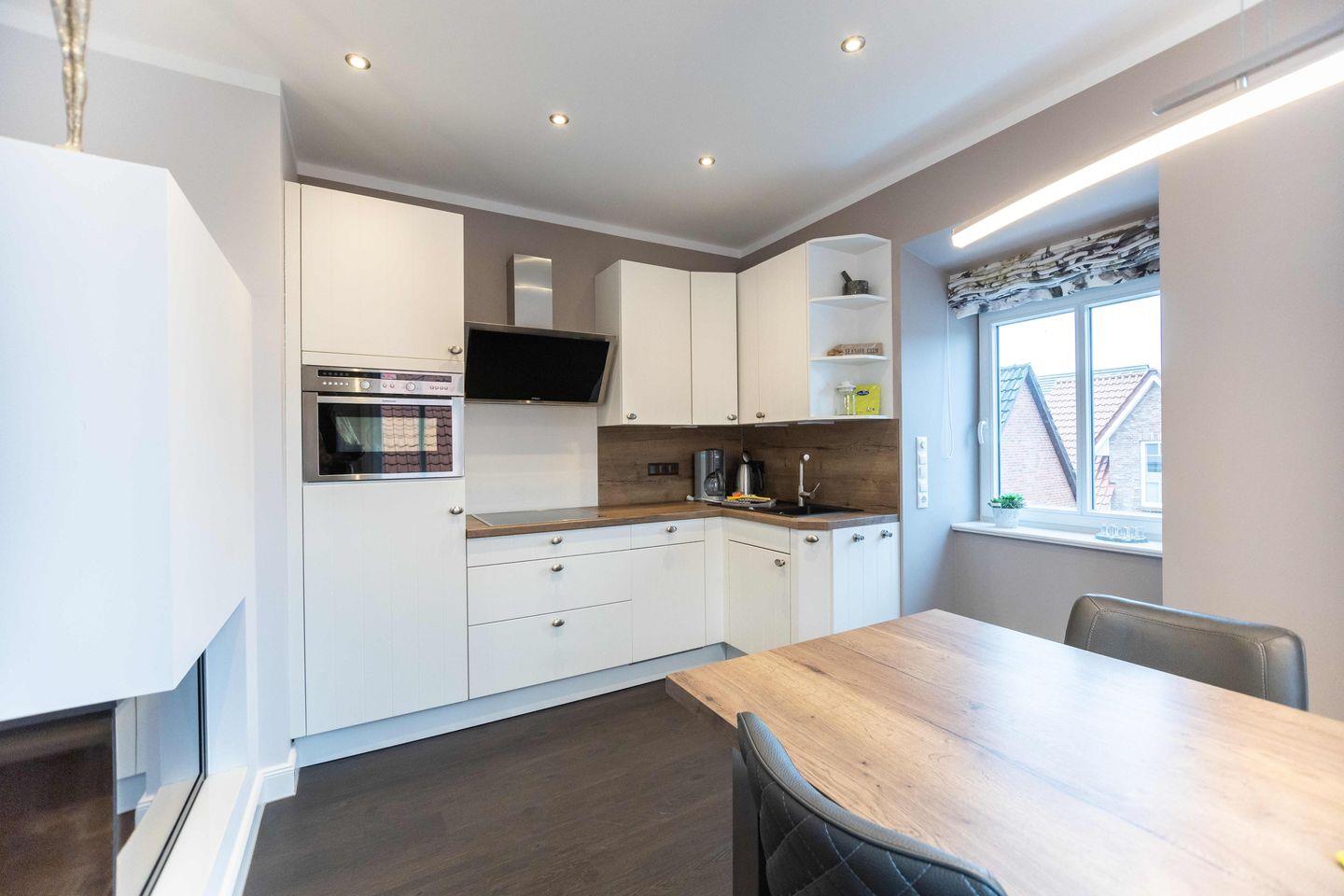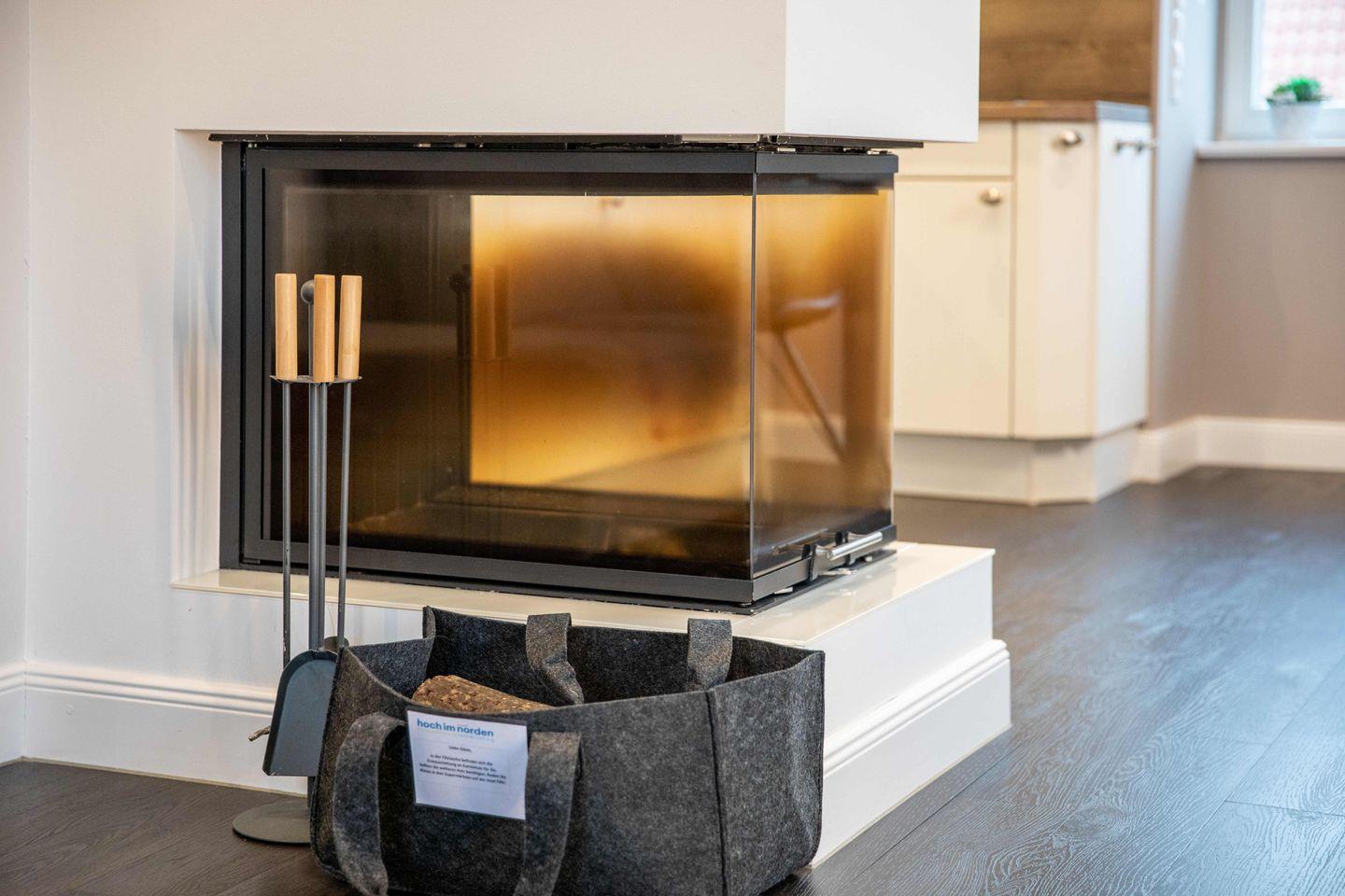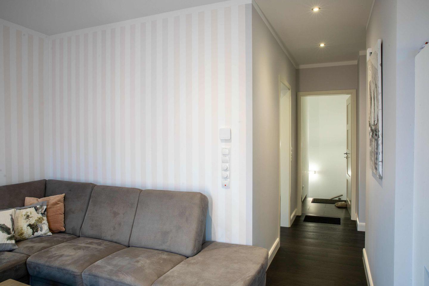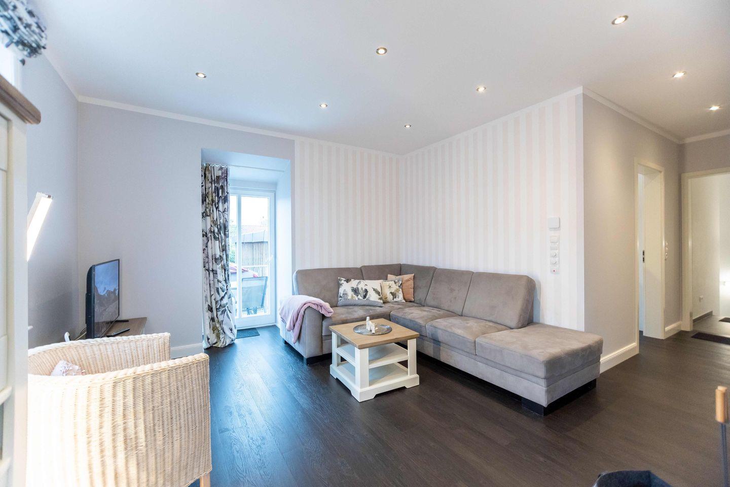 Über den separaten Eingang betreten Sie den Flur der ca. 80 m² großen Wohnung. Hier finden Jacken und Schuhe ausreichend Platz. Vom Flur aus gelangen Sie in den offenen Wohn- und Essbereich mit integrierter Küche. Das Highlight in diesem Raum ist der stilvolle Kamin, der auch an kalten Tagen für eine Wohlfühlatmosphäre sorgt.