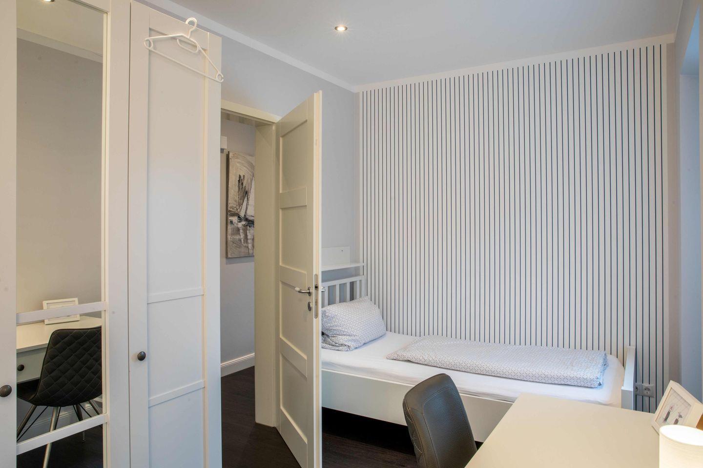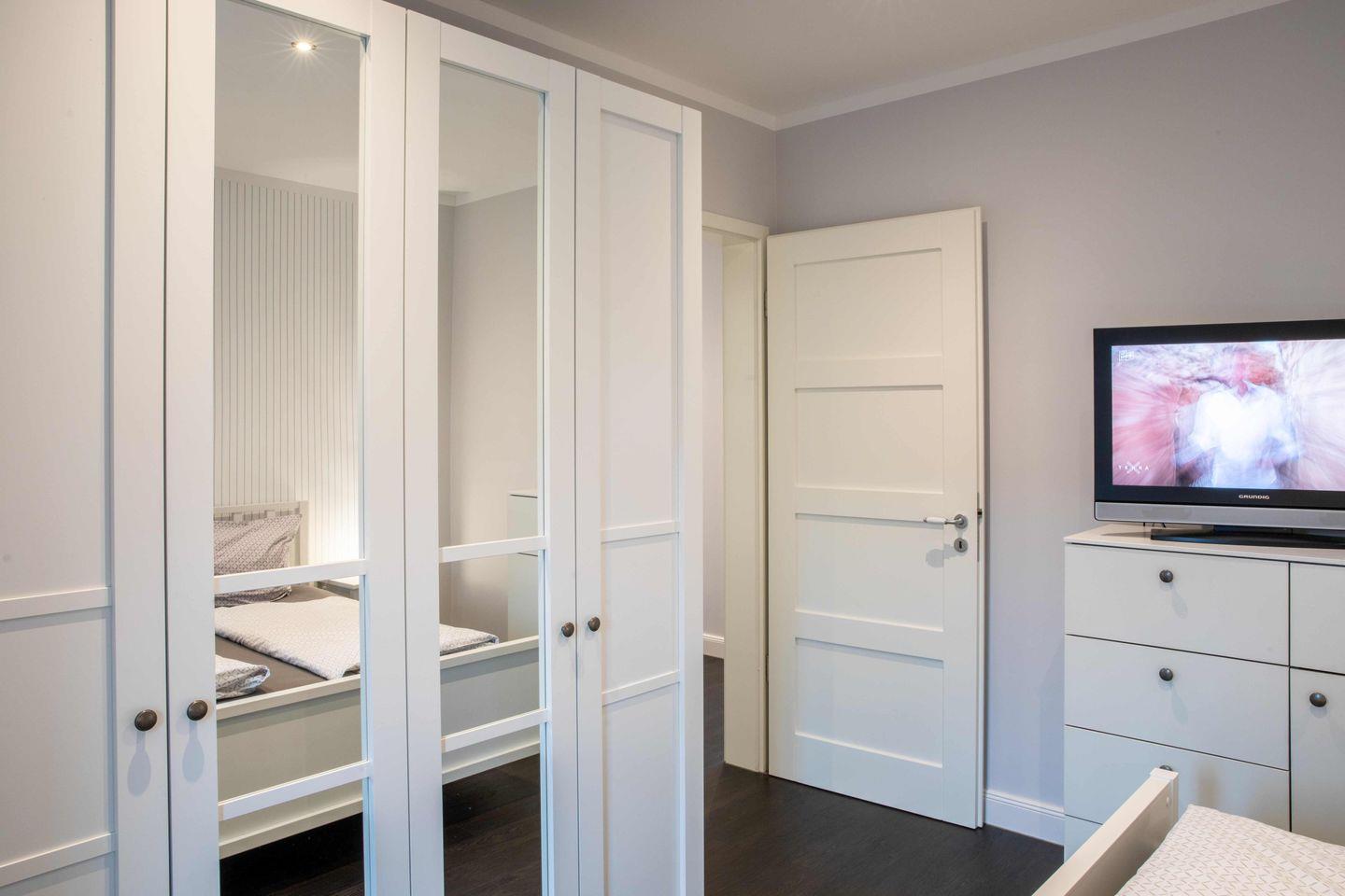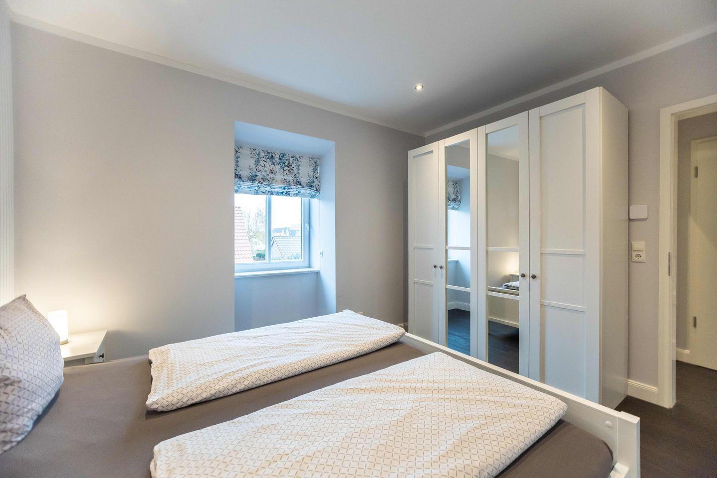 Eines der beiden Schlafzimmer ist mit einem Doppelbett (180x200), das andere Schlafzimmer mit zwei getrennt stehenden Einzelbetten ausgestattet. Beide Schlafzimmer verfügen jeweils über einen Kleiderschrank. Das moderne Duschbad ist in hellen Farben gehalten. Das Highlight der Wohnung ist der wohnungseigene Balkon, welcher geschützt in Richtung des Innenhofes liegt. Ein besonderes Highlight ist der Strandkorb, der Ihnen inklusive Strandlaken von Mai bis September am Wyker Strand (Abschnitt 5) zur Verfügung steht. Dieser befindet sich keine 3 Minuten von Ihrer Ferienwohnung entfernt und ermöglicht entspannte Stunden direkt am Meer.