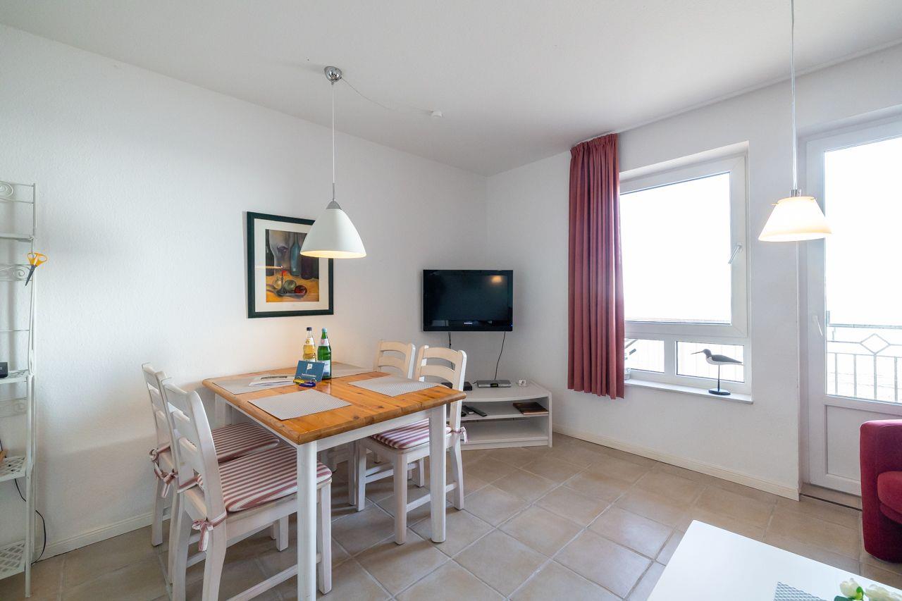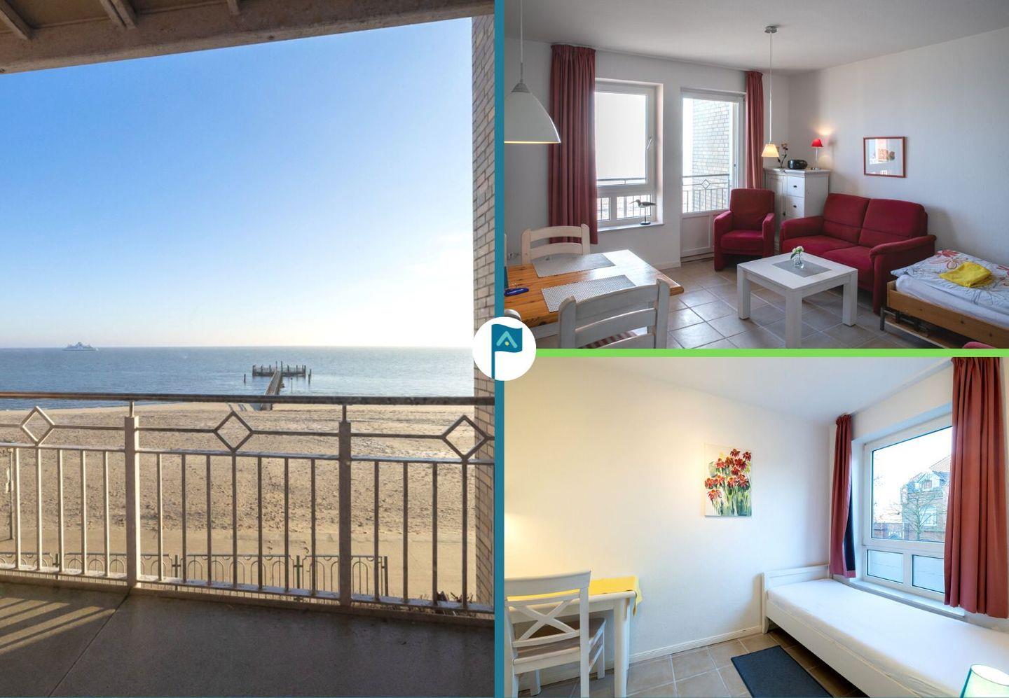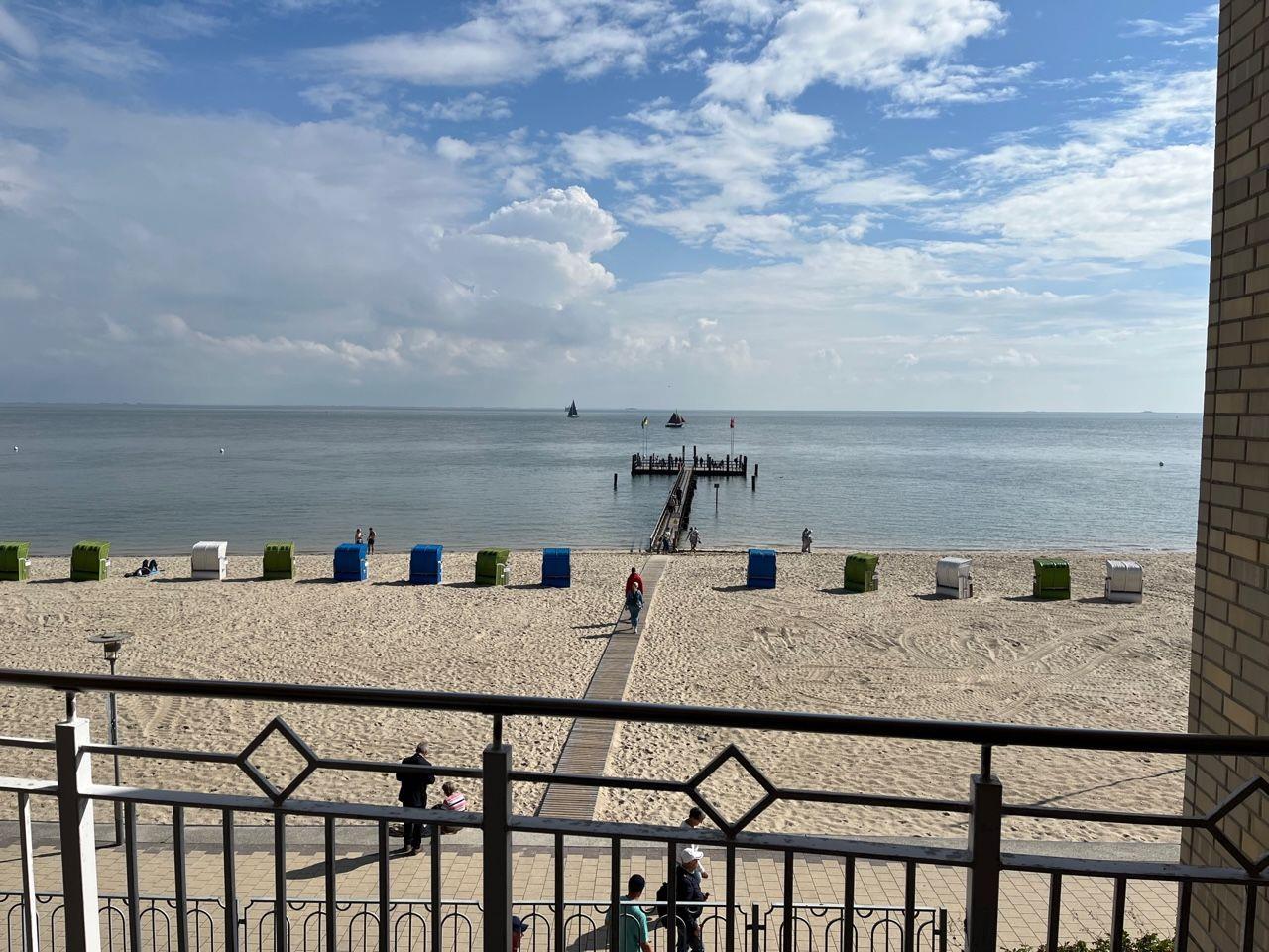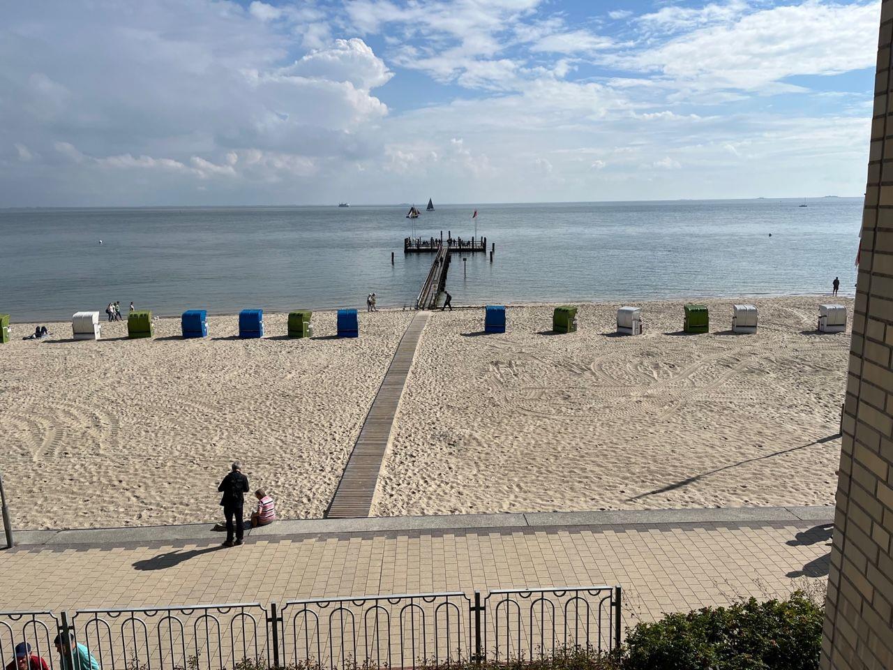 Die Wohnung selbst liegt in der 1. Etage mit einem Balkon. Besonders hervorzuheben ist der direkte Blick auf das Meer Richtung Osten. Hier lassen sich die eigenen Kinder beim Spielen beobachten.