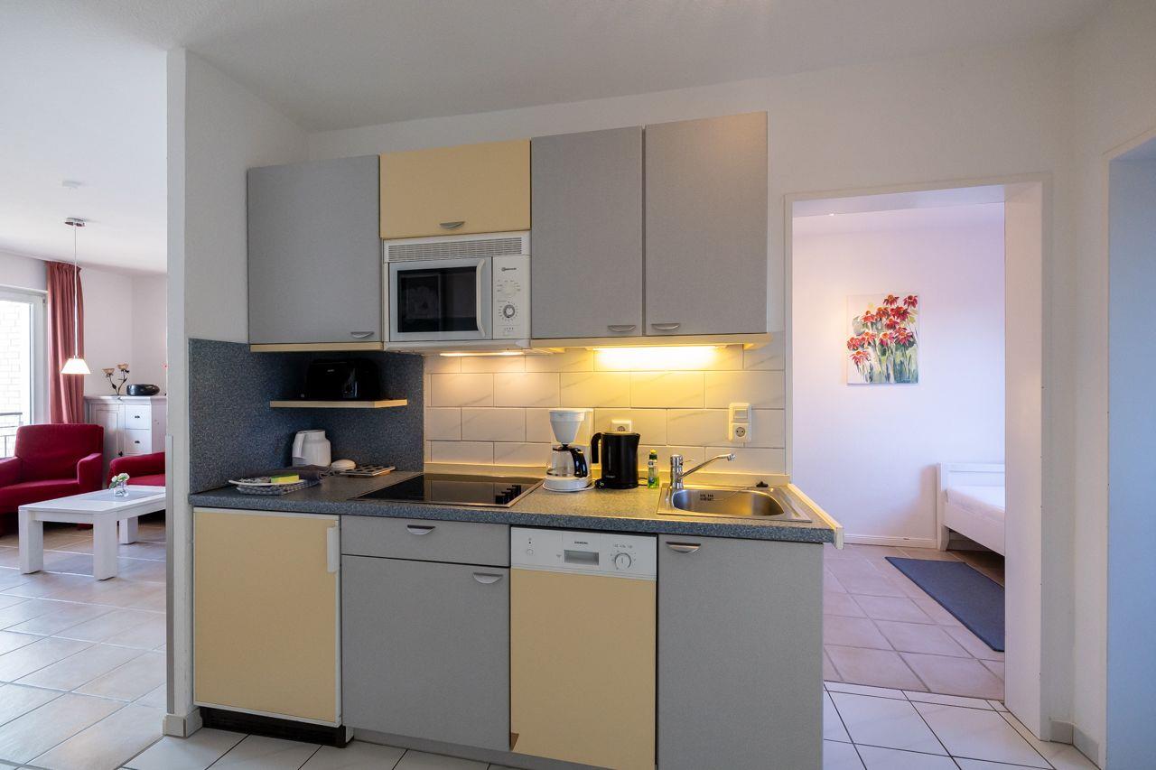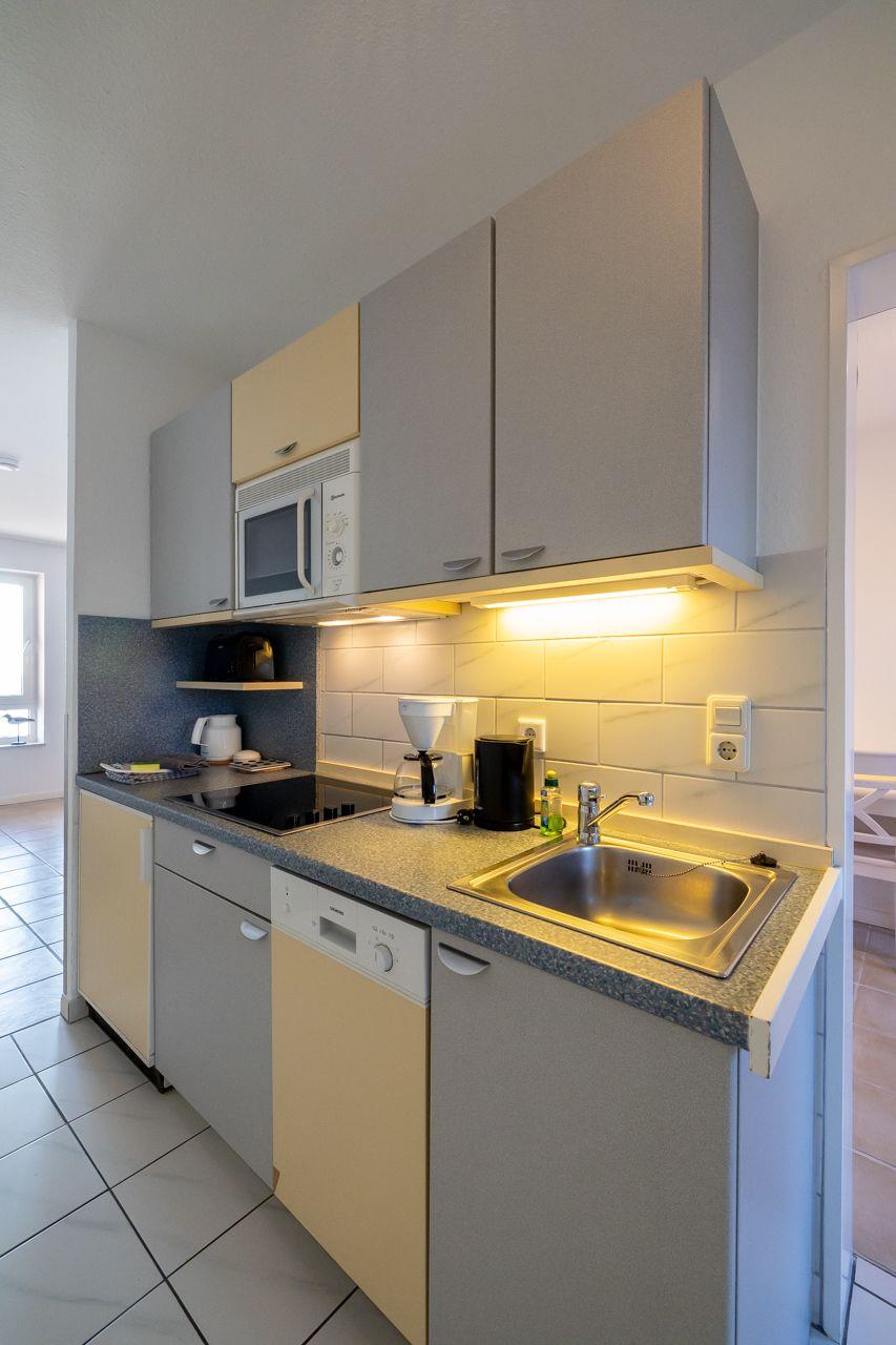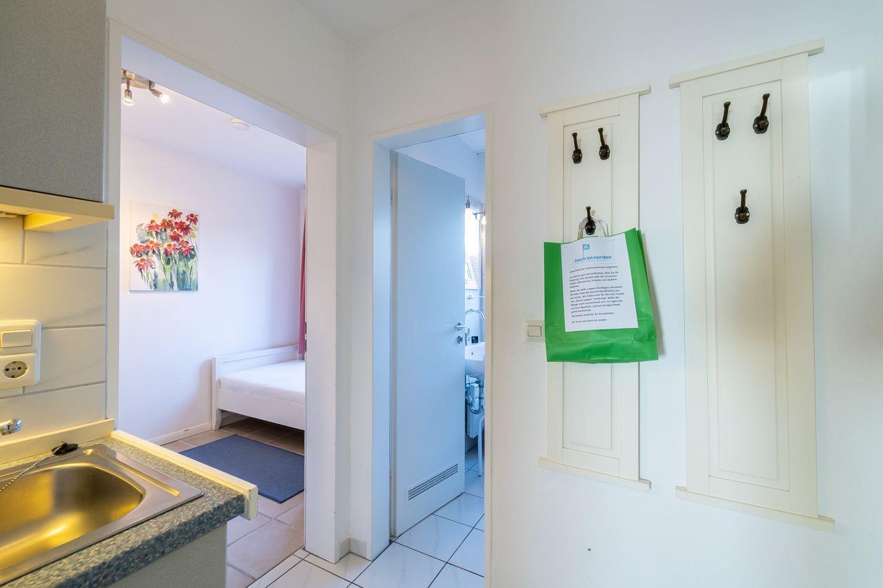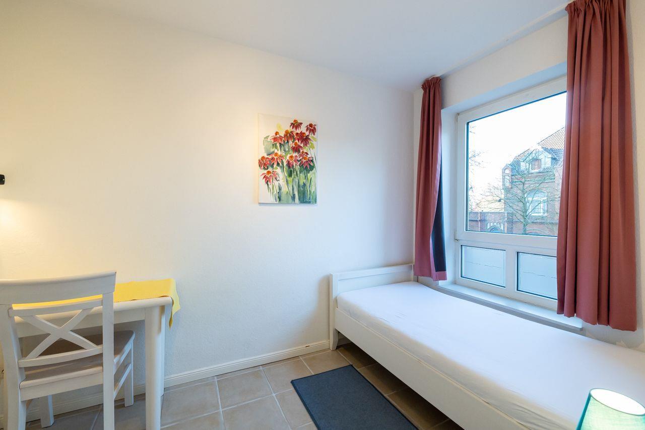 Vom Wohnungsflur aus gelangen Sie zur praktischen Küchenzeile, dem kombinierten Wohn-Schlafzimmer, dem Schlafzimmer mit Einzelbett und dem neuwertigen Duschbad mit Fenster und Tageslicht. Die Küchenzeile ist modern und zweckmäßig ausgestattet, vorhanden sind: u.a. eine Mikrowelle und ein kleines Cerankochfeld. Das Duschbad ist in einem neuen Zustand. Zur Ausstattung gehören: großflächige Fliesen und eine moderne Duschkabine.