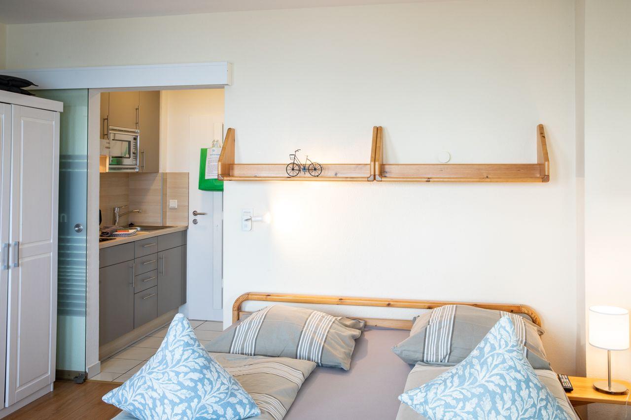 Die Wohnung besteht aus einem Wohnschlafraum mit einem Doppelbett (180x200), Duschbad und Küchenzeile. Ebenso hat diese Wohnung eine große Tür und Fenster mit Balkon zum Wasser, mit uneingeschränkten Meerblick. W-Lan, Satelliten-TV und CD-Player und Blue-Ray, Radio sind natürlich vorhanden. Bei Bedarf stellen wir Ihnen gern ein Kinderreisebett und/ oder einen Hochstuhl kostenfrei bereit. Auf Anfrage ist die Mitnahme eines Hundes möglich.