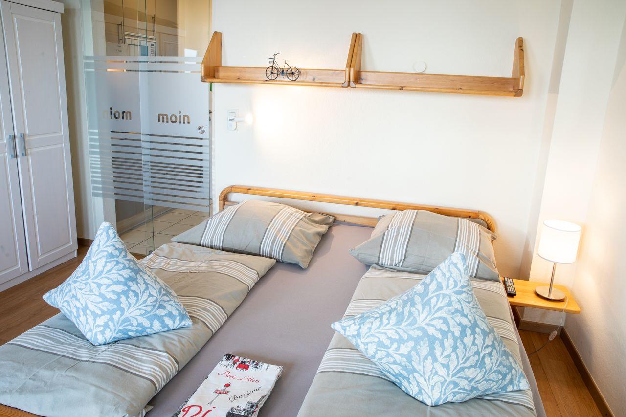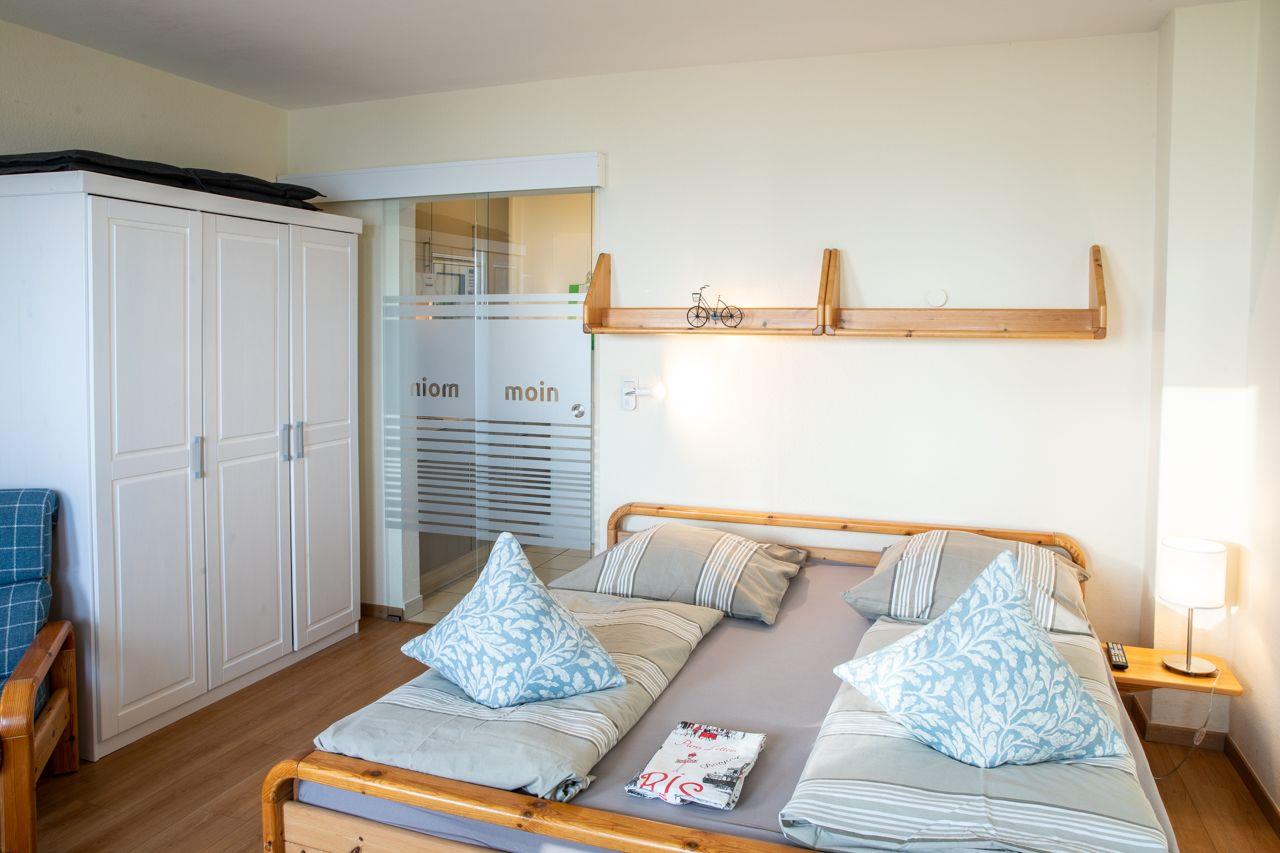 Die Wohnung besteht aus einem Wohnschlafraum mit einem Doppelbett, Duschbad und Küchenzeile. Ebenso hat diese Wohnung eine große Tür und Fenster mit Balkon zum Wasser, mit uneingeschränkten Meerblick. W-Lan, Satelliten-TV und CD-Player und Blue-Ray, Radio sind natürlich vorhanden. Bei Bedarf stellen wir Ihnen gern ein Kinderreisebett und/ oder einen Hochstuhl kostenfrei bereit. Auf Anfrage ist die Mitnahme eines Hundes möglich.
