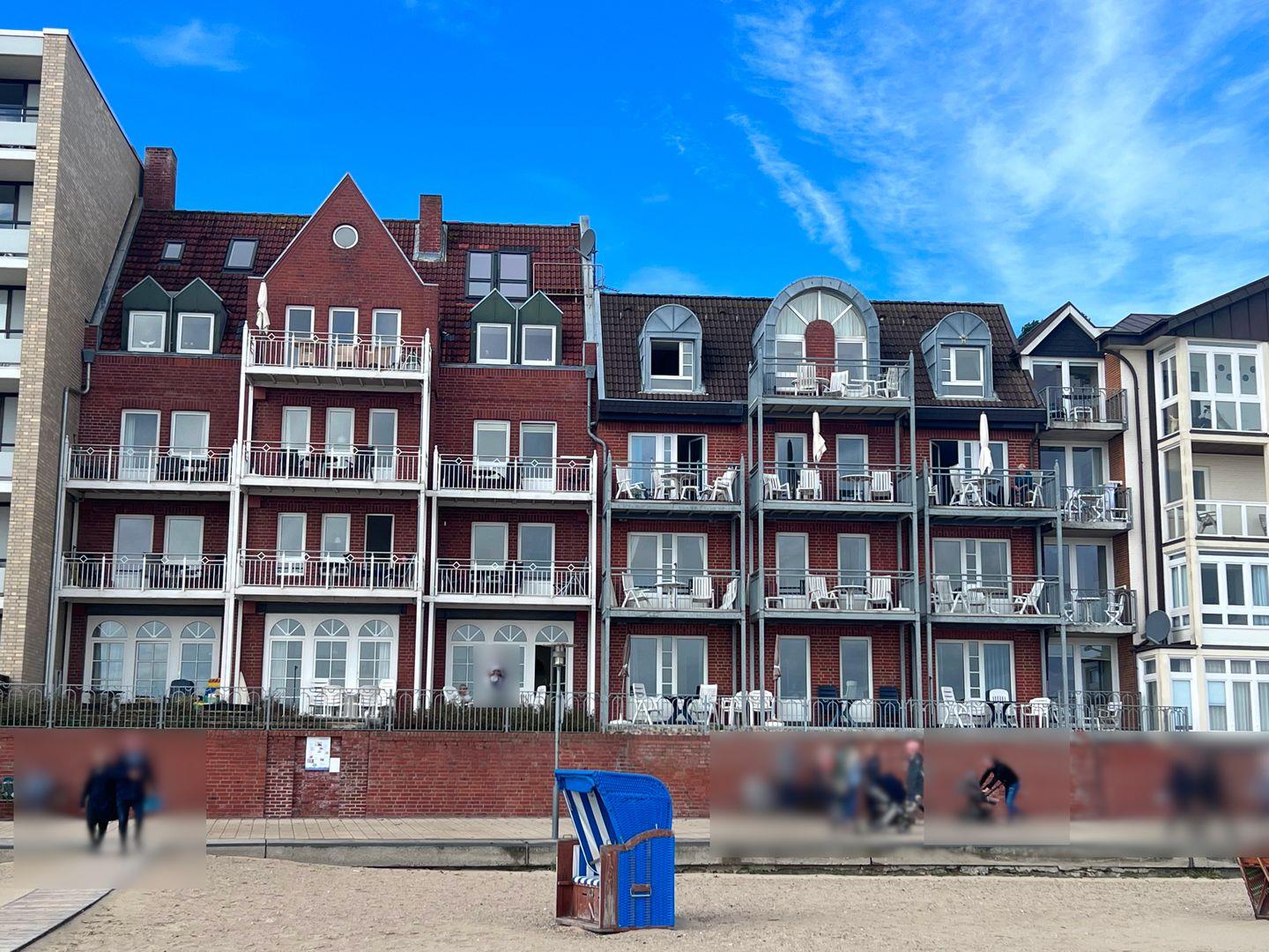 Die Wohnung selbst ist über die Treppe erreichbar und liegt im 2. Obergeschoss. Besonders hervorzuheben ist der direkte Blick auf das Meer Richtung Osten. Ihr Balkon ist überdacht, so dass Sie auch bei Regen draußen sitzen und die frische Nordseeluft genießen können.