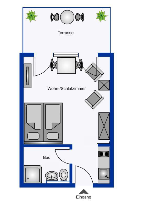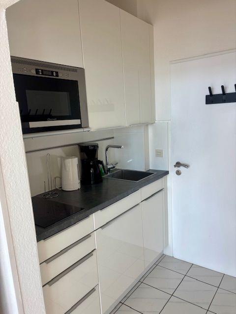 Vom Wohnungsflur zweigen ab: die praktische Küchenzeile, das kombinierte Wohn-Schlafzimmer mit einem komfortablen Doppelbett (180x200) und das Duschbad. Die moderne und zweckmäßig ausgestattete Küchenzeile bietet unter anderem eine Mikrowelle und ein kleines Cerankochfeld. Das Duschbad präsentiert sich in neuem Zustand und überzeugt mit großflächigen Fliesen sowie einer modernen Duschkabine.