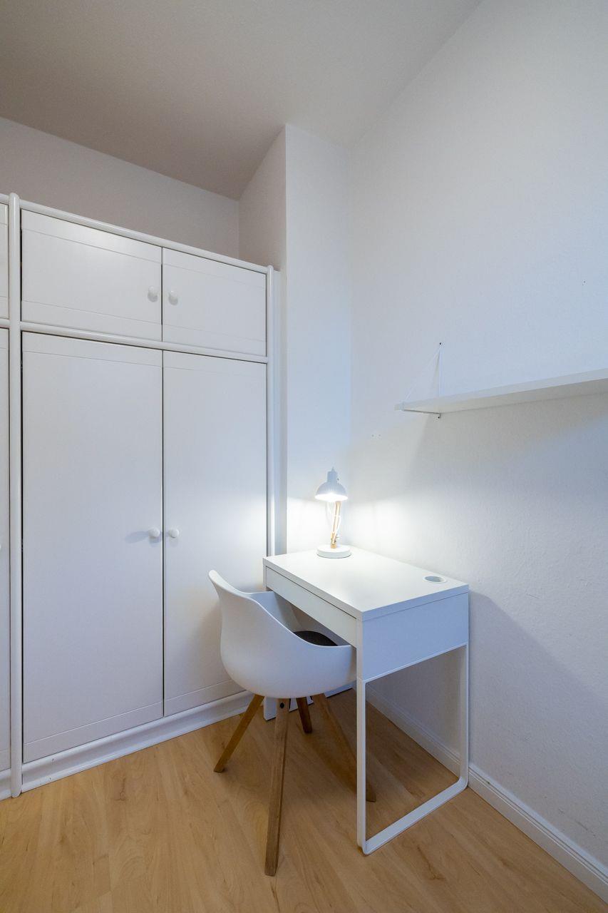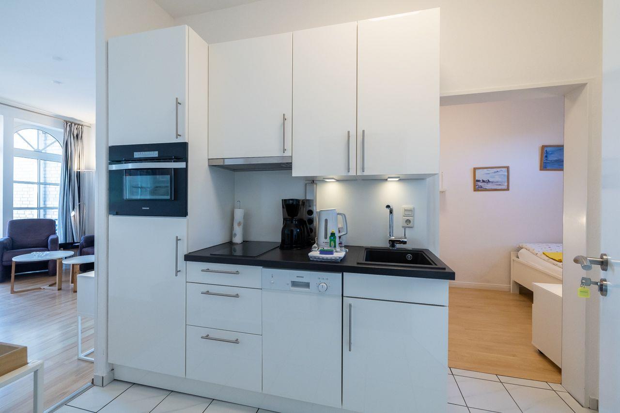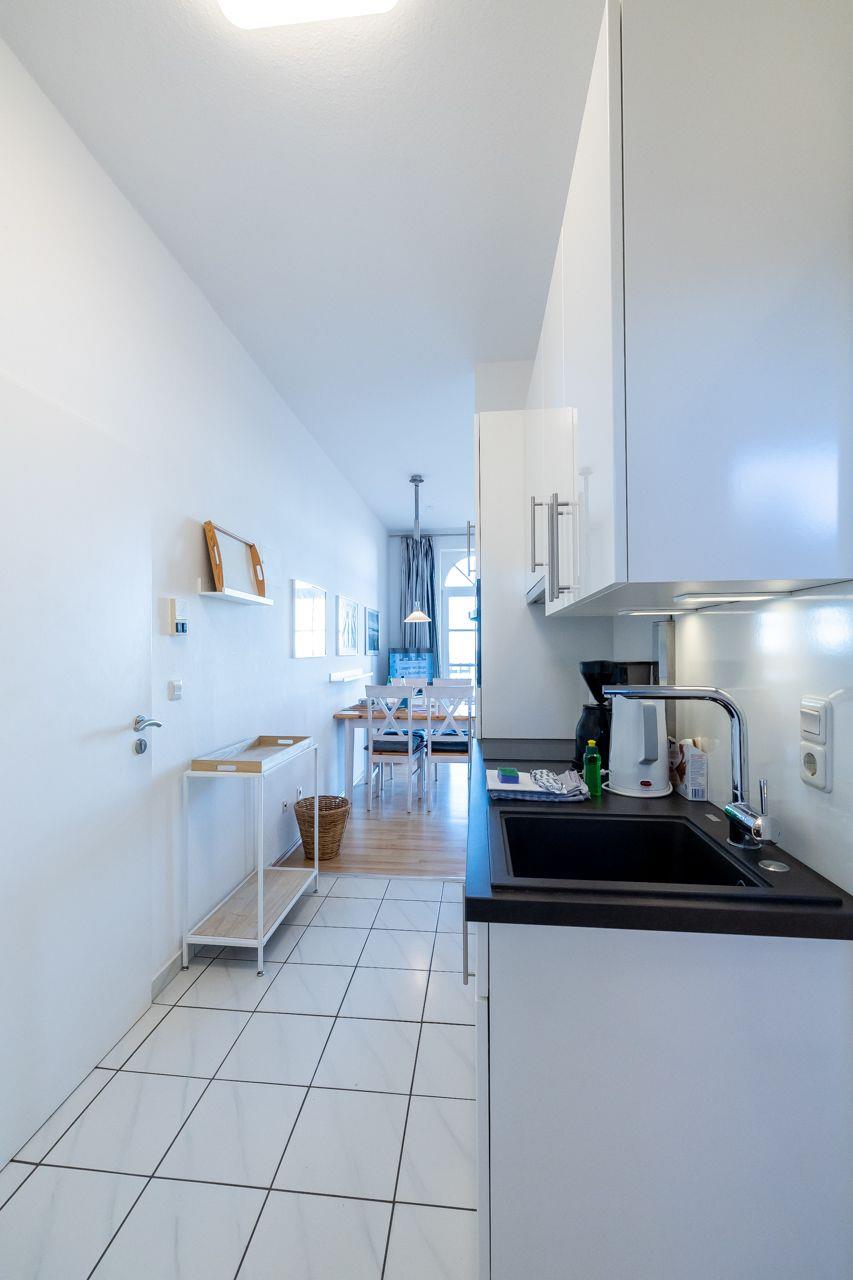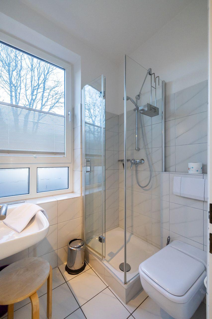 Vom Wohnungsflur aus gelangen Sie zur praktischen Küchenzeile, dem kombinierten Wohn-Schlafzimmer mit einem Schrankbett (180x200), dem Schlafzimmer mit Einzelbett (90x200) und dem Duschbad mit Fenster und Tageslicht. Die Küchenzeile ist modern und zweckmäßig ausgestattet, vorhanden sind: u.a. eine Mikrowelle und ein kleines Cerankochfeld. Das Duschbad ist in einem neuen Zustand. Zur Ausstattung gehören: großflächige Fliesen und eine moderne Duschkabine.