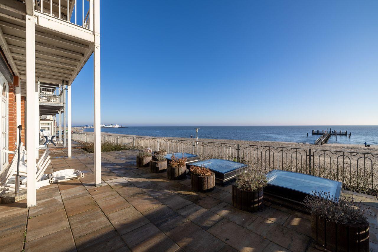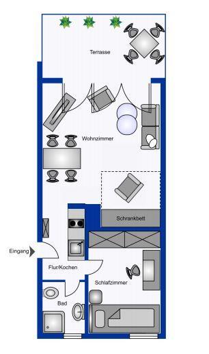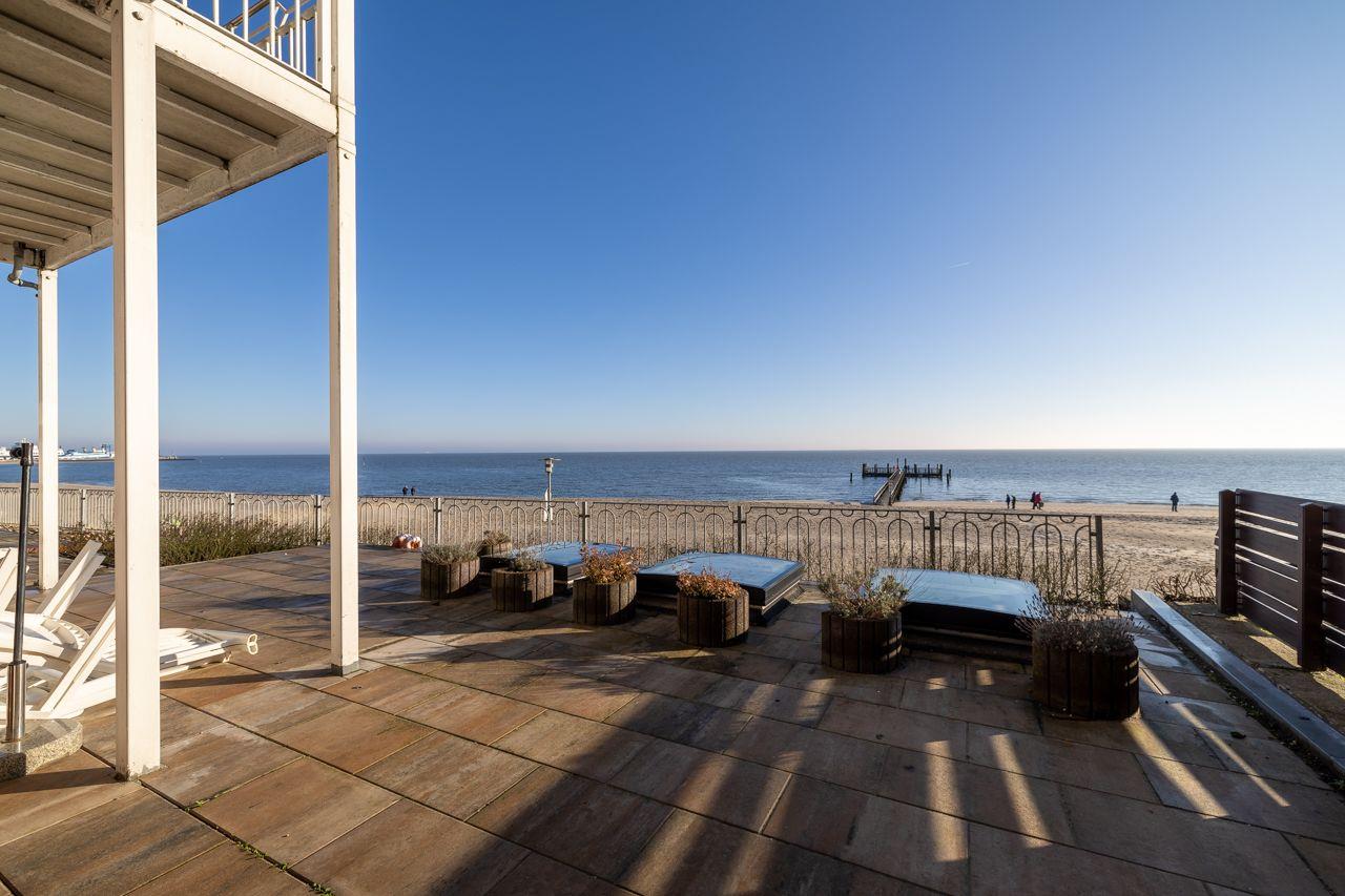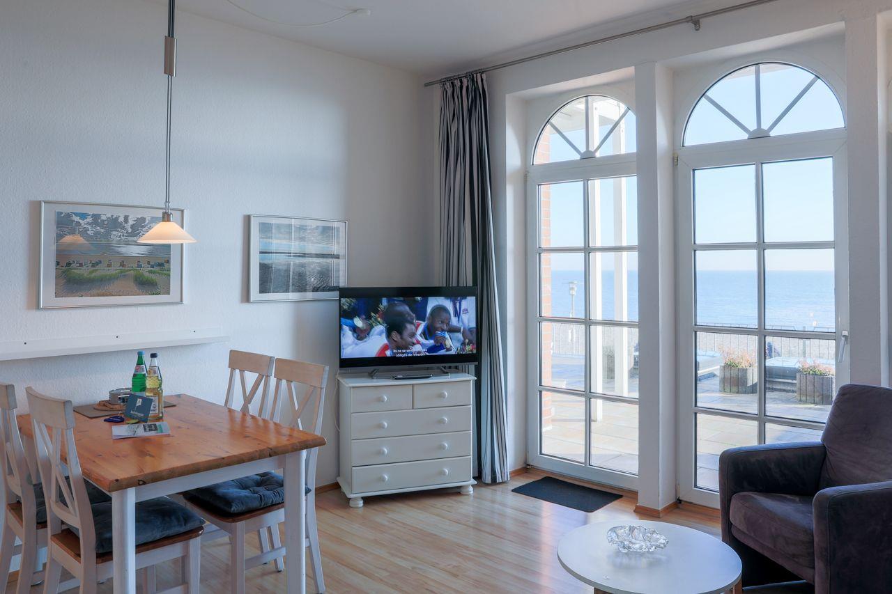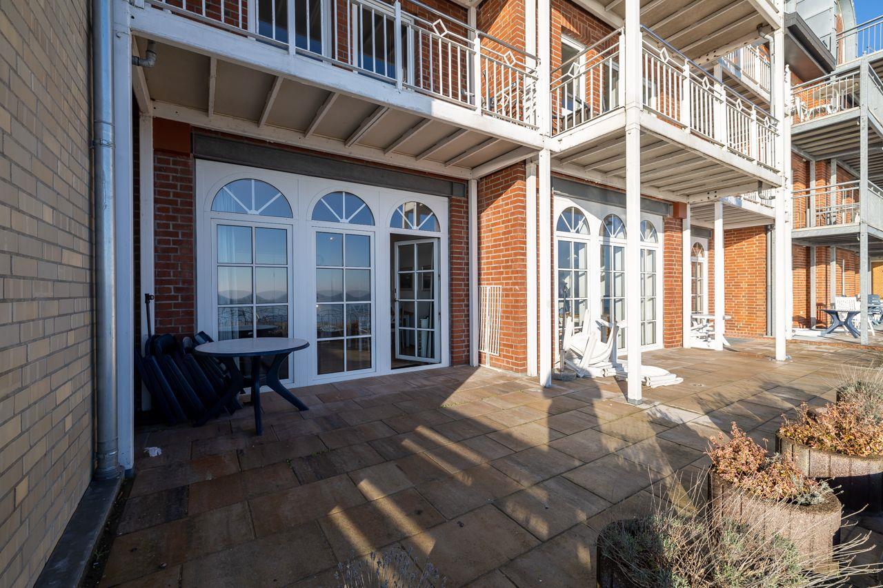 Die Wohnung selbst liegt im Erdgeschoss mit großer Terrasse. Besonders hervorzuheben ist der direkte Blick auf das Meer Richtung Osten. Hier lassen sich die eigenen Kinder beim Spielen beobachten.