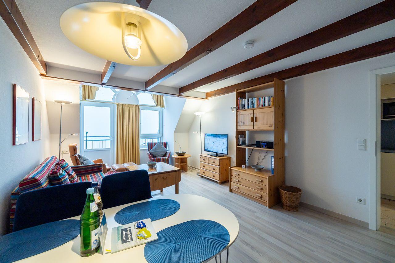 Die Wohnung selbst liegt im 3. Obergeschoss und ist per Fahrstuhl plus Treppe erreichbar. Besonders hervorzuheben ist der direkte Blick auf das Meer Richtung Osten. Hier lassen sich die Geschehnisse am Strand bestens beobachten.