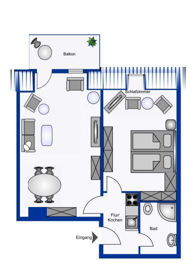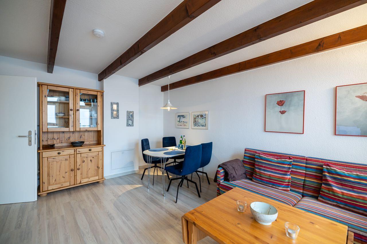 Vom Wohnungsflur aus gelangen Sie ins das große Schlafzimmer mit Doppelbett (180x200) und Meerblick, das moderne Duschbad und das lichtdurchflutete Wohnzimmer mit Meerblick und Balkon. Die Küchenzeile ist gut ausgestattet und bietet auch im Urlaub, Gelegenheit gut zu kochen. Das Duschbad ist neu und mit hellen, modernen Fliesen ausgestattet.