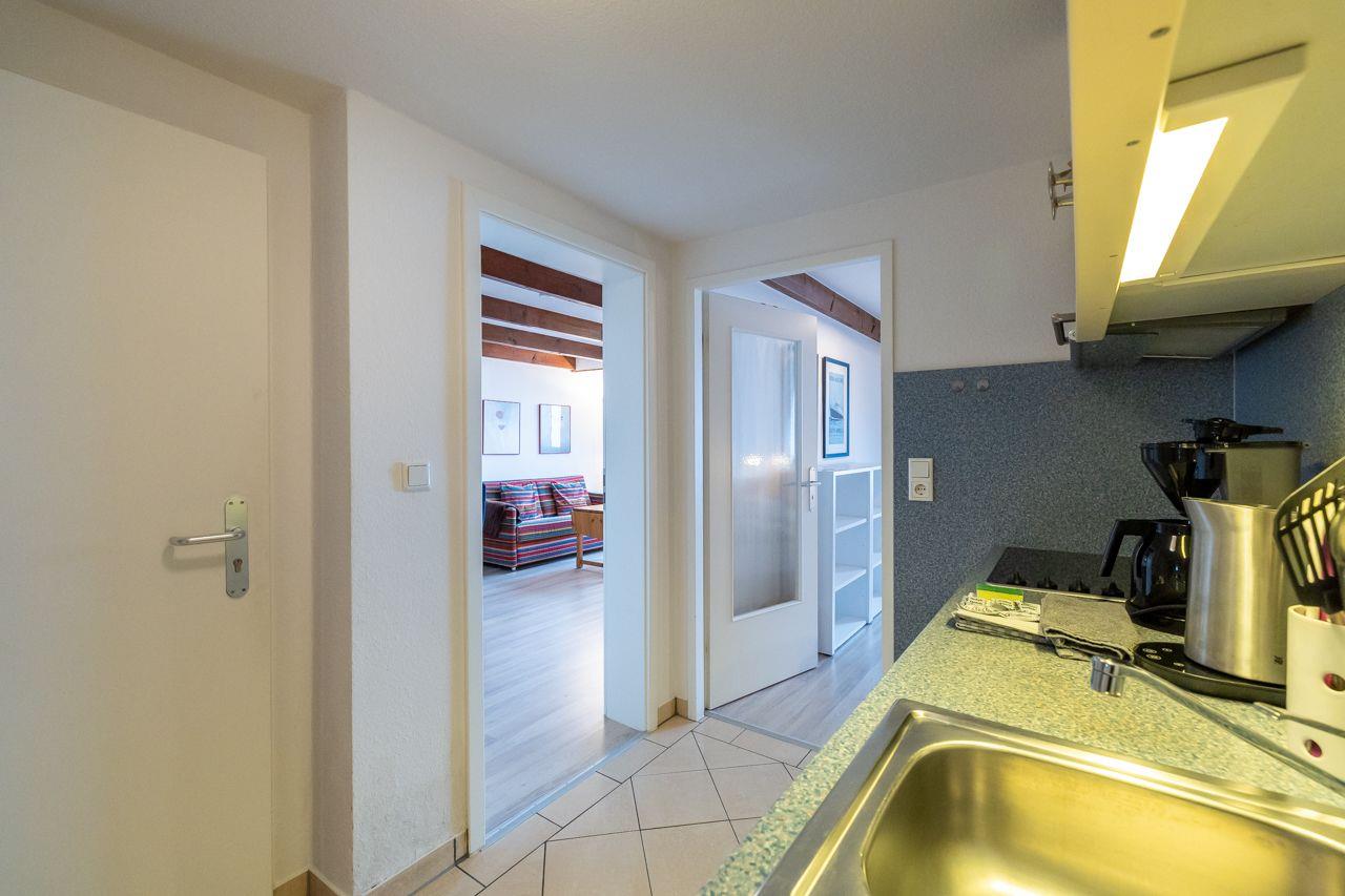 Vom Wohnungsflur aus gelangen Sie ins das große Schlafzimmer mit Doppelbett und Meerblick, das moderne Duschbad und das lichtdurchflutete Wohnzimmer mit Meerblick und Balkon. Die Küchenzeile ist gut ausgestattet und bietet auch im Urlaub, Gelegenheit gut zu kochen. Das Duschbad ist neu und mit hellen, modernen Fliesen ausgestattet.