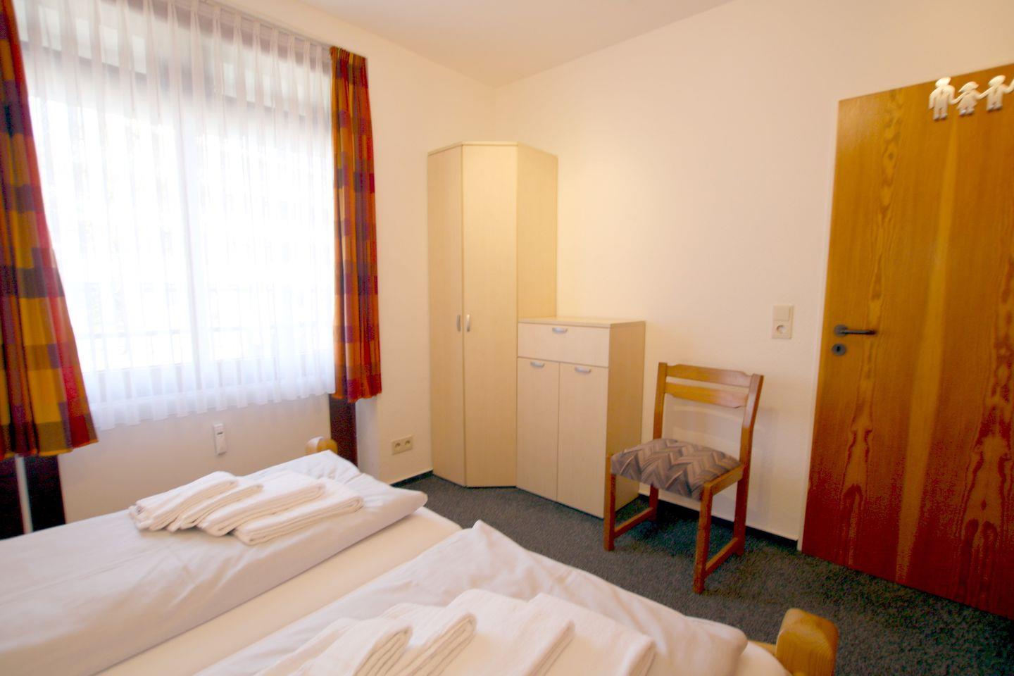 - Schafzimmer mit Doppelbett (180 x 200 cm) und Kleiderschrank und Stuhl