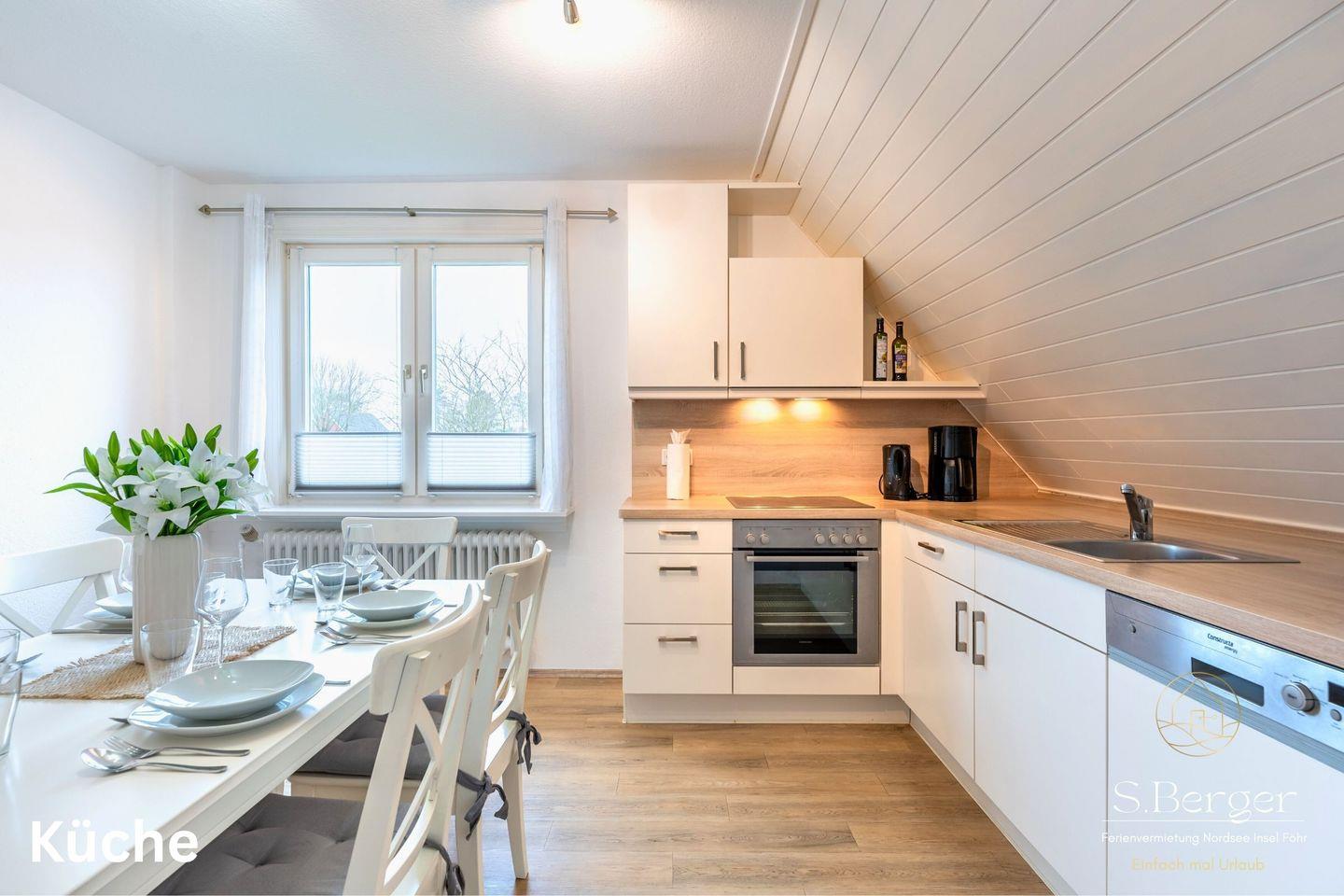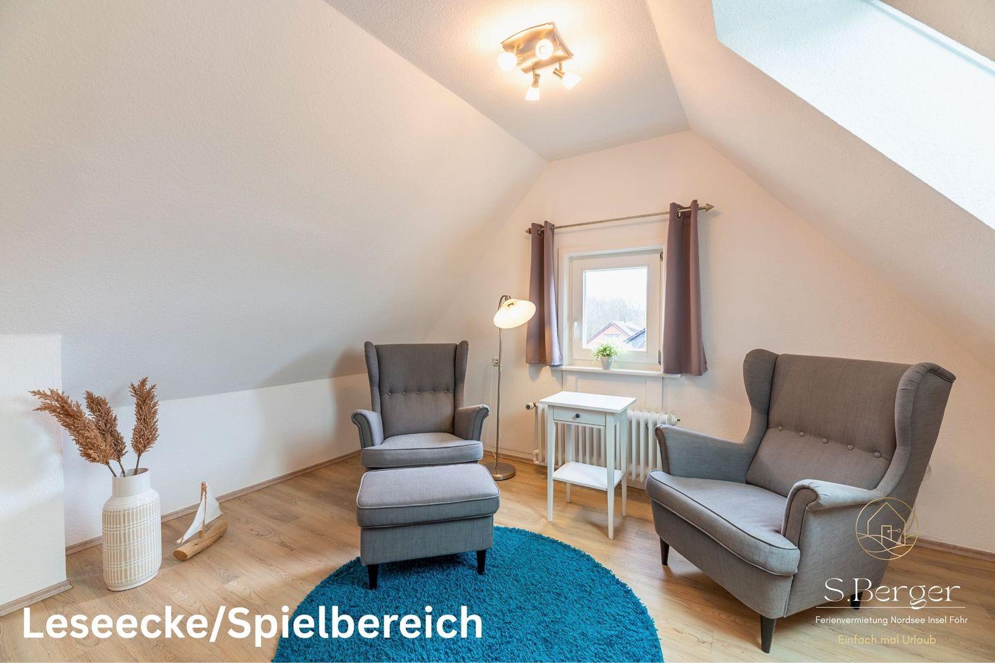 Das Dachgeschoss (leicht steilere Treppe) bietet somit einen idealen Rückzugsort für die jüngeren Gäste oder für jene, die in Ruhe ein Buch lesen möchten. Die helle und freundliche Gestaltung lädt zum Verweilen ein und lässt der Fantasie freien Lauf. Ob beim Schmökern in spannenden Geschichten oder beim kreativen Spielen, hier können Kinder sich in ihrer eigenen kleinen Welt entfalten. Ein perfekter Ort, um nach einem aufregenden Tag am Strand zur Ruhe zu kommen und die Erlebnisse Revue passieren zu lassen. Die Kombination aus Praktikabilität und Gemütlichkeit macht diesen Raum zu einem Highlight der Ferienwohnung, in dem sich kleine und große Gäste gleichermaßen wohlfühlen können.