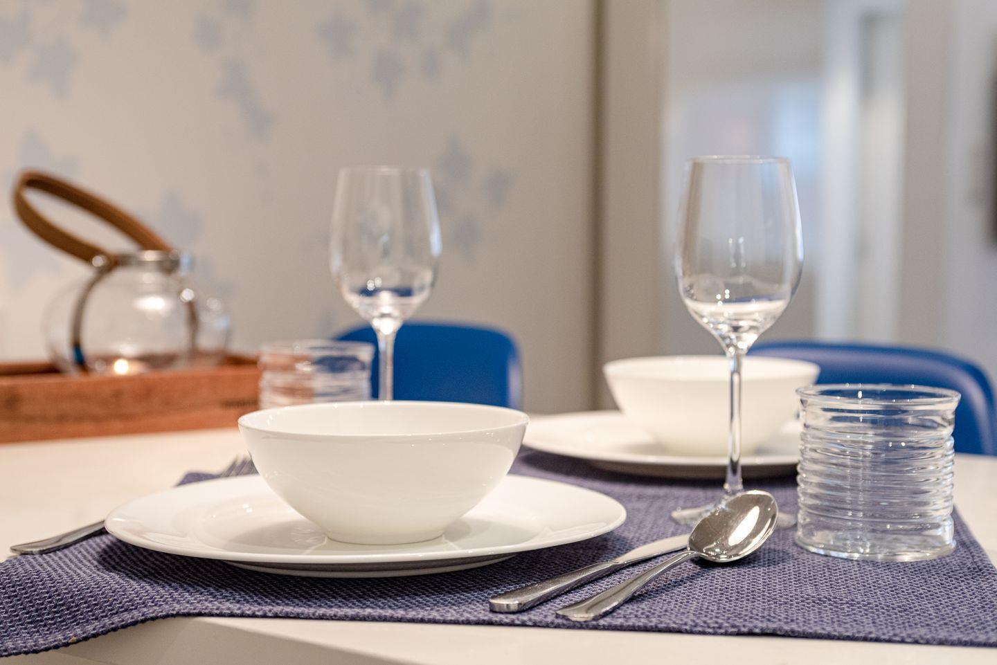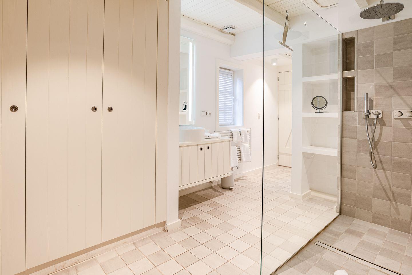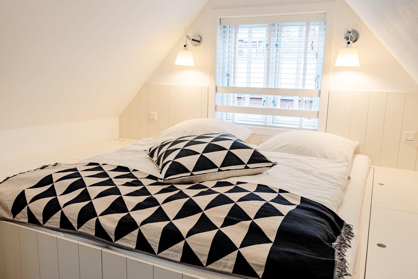 Durch die mit Efeu behangene Fassade gelangen Sie in den kleinen Flur. Dort finden Jacken und Schuhe genug Platz. In dem kombinierten Wohn-/Esszimmer mit halboffener Küche und Schlafsofa befindet sich der Esstisch mit Platz für bis zu vier Personen. Ebenfalls im Erdgeschoss befindet sich das Bad mit einer großzügigen, bodengleichen Dusche, der hauseigenen Sauna und einer Waschmaschine. Im Obergeschoss befindet sich ein Schlafzimmer mit Doppelbett.