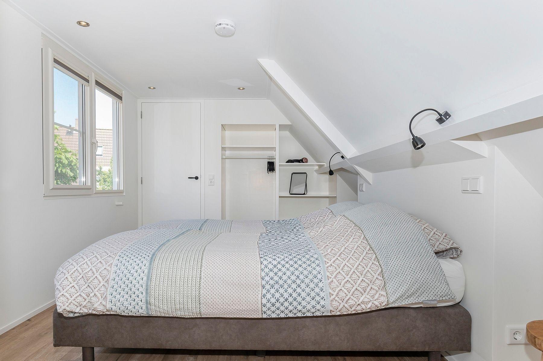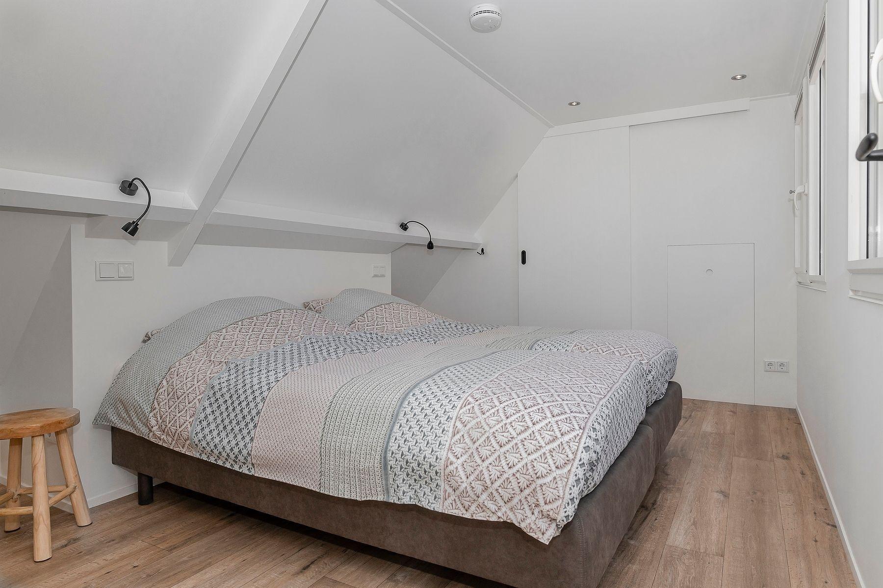 Das Schlafzimmer mit Klimaanlage hat 2 schöne 90 x 200 cm Boxspringbetten und bei Ihrer Ankunft ist Ihr Bett gemacht. Unter der Schräge gibt es Platz für Ihre Tasche oder Ihren Koffer. Für Ihre Kleidung gibt es einen offenen Kleiderschrank mit Hänge- und Liegefläche. Am Kopfende des Bettes befinden sich Steckdosen und Leselampen. Das Zimmer hat Verdunklungsvorhänge und Insektenschutzgitter vor den Fenstertüren. Eine Schiebetür führt in die angrenzende Toilette.