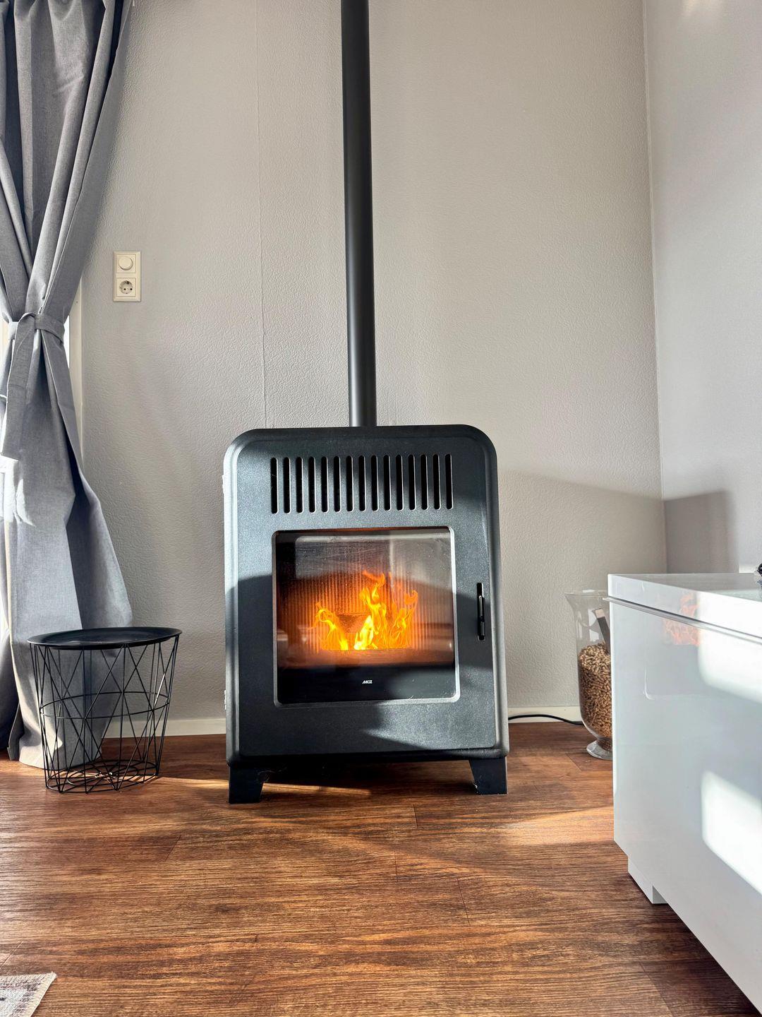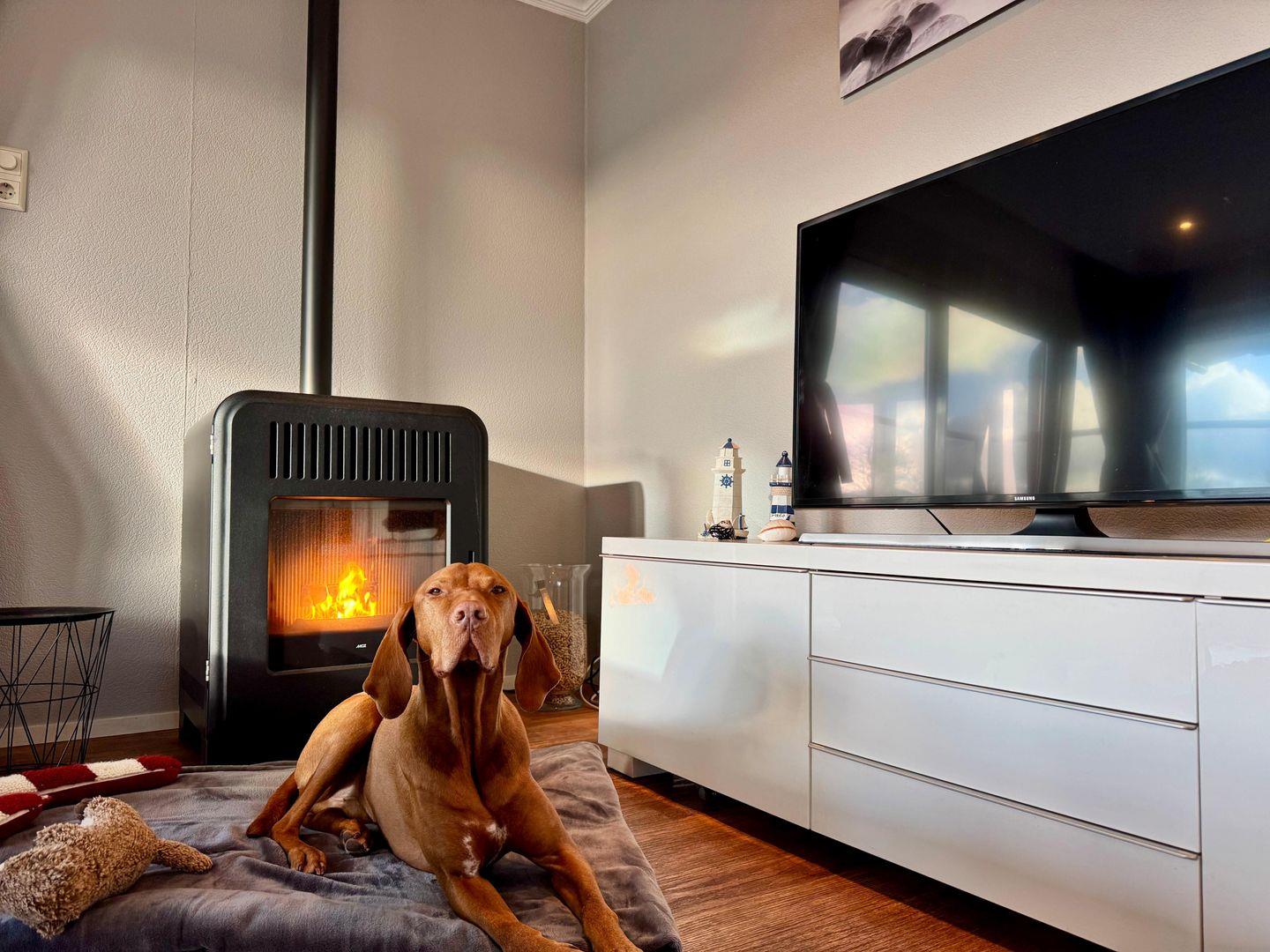 Das Herzstück des Chalets bildet das offene, helle Wohnzimmer mit gemütlicher Sofaecke, Sessel und großem TV (44–55 Zoll, internationale Kanäle), angrenzendem Essbereich und moderner offener Küche. Die Küchenausstattung umfasst Gasherd, Backofen, Mikrowelle, Kühlschrank mit Gefrierfach, Spülmaschine, Wasserkocher, Senseo-Espressomaschine sowie alle notwendigen Küchenutensilien, Geschirr und Besteck. Ein Esstisch bietet Platz für gemeinsame Mahlzeiten. Praktisch sind der vorhandene Kamin/Ofen und die Gasheizung, die auch in der kühleren Jahreszeit Behaglichkeit bieten.