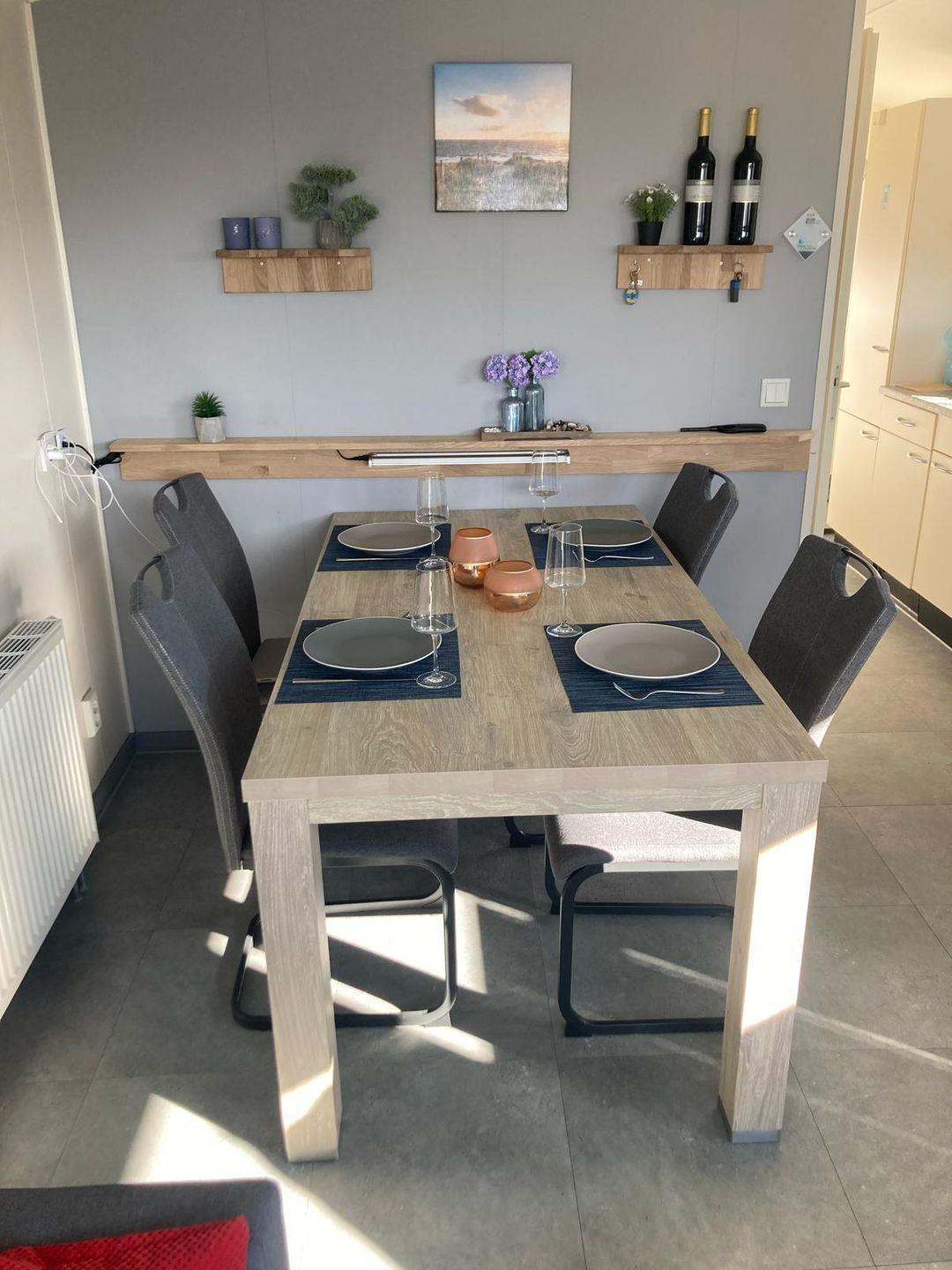 Chalet Lauri, Baujahr 2012 mit einer Sonnenterrasse und einer Rasenfläche, komplett eingezäunt. Das Haus ist gut ausgestattet, die Möblierung ist modern und bietet einen sehr gemütlichen Wohn-/Essbereich mit der offenen Küche. Eine weitere Tür im Wohnzimmer ermöglicht einen direkten Zugang von Wohnbereich zur Terrasse. Outdoor Esstisch sowie Stühle und Liegen sind vorhanden. Der Strand ist in ca. 3-4 Minuten zu Fuß erreichbar.