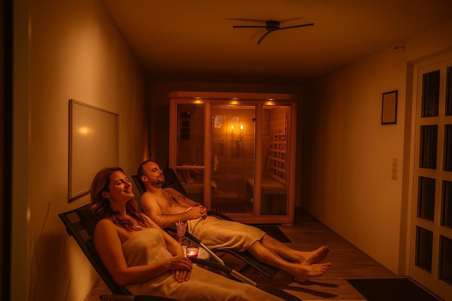 Für besondere Entspannung sorgt der separate Anbau mit Infrarotsauna, Ruhebereich und zusätzlicher Terrasse. Ob Sauna nach einem Strandtag, Kaminfeuer im Winter oder ein Glas Wein mit Blick ins Grüne – hier ist Erholung garantiert.