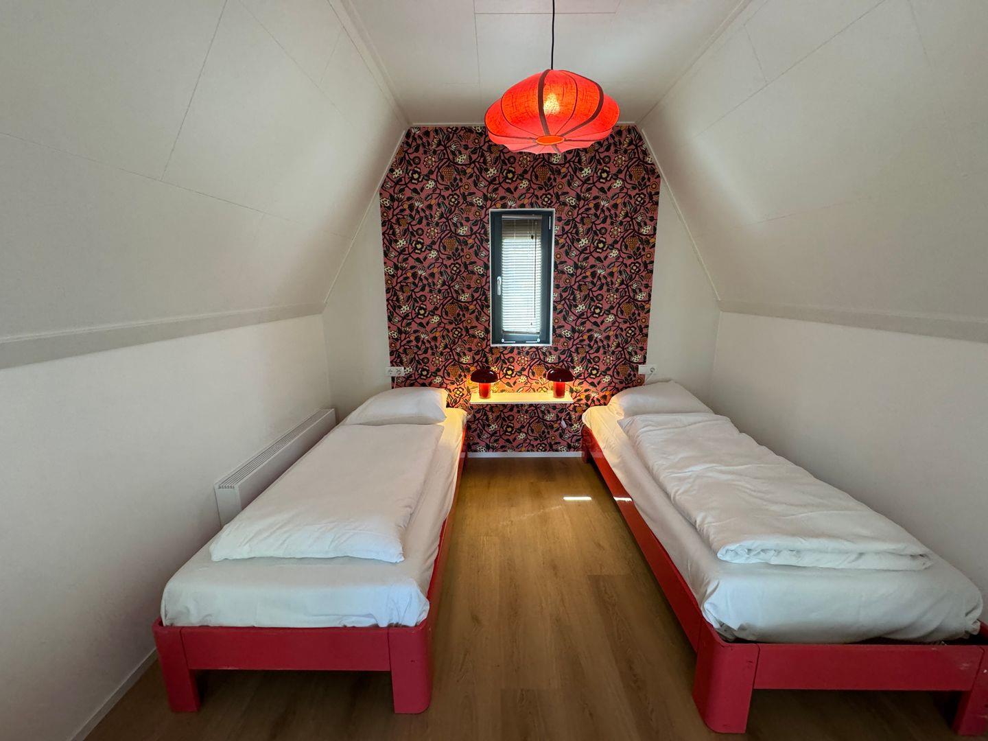 Vom Hauptschlafzimmer im Obergeschoss aus haben Sie durch eine raumhohe Glaswand einen herrlichen Blick über das IJsselmeer. Allein schon mit dieser Aussicht eine Tasse Kaffee zu trinken und ein Buch zu lesen, macht den Urlaub zu einem 10-Punkte-Erlebnis. Direkt neben diesem Zimmer befindet sich eines der beiden Badezimmer mit Toilette und auf der anderen Seite des Flurs ein (Kinder-)Schlafzimmer mit 2 Einzelbetten.