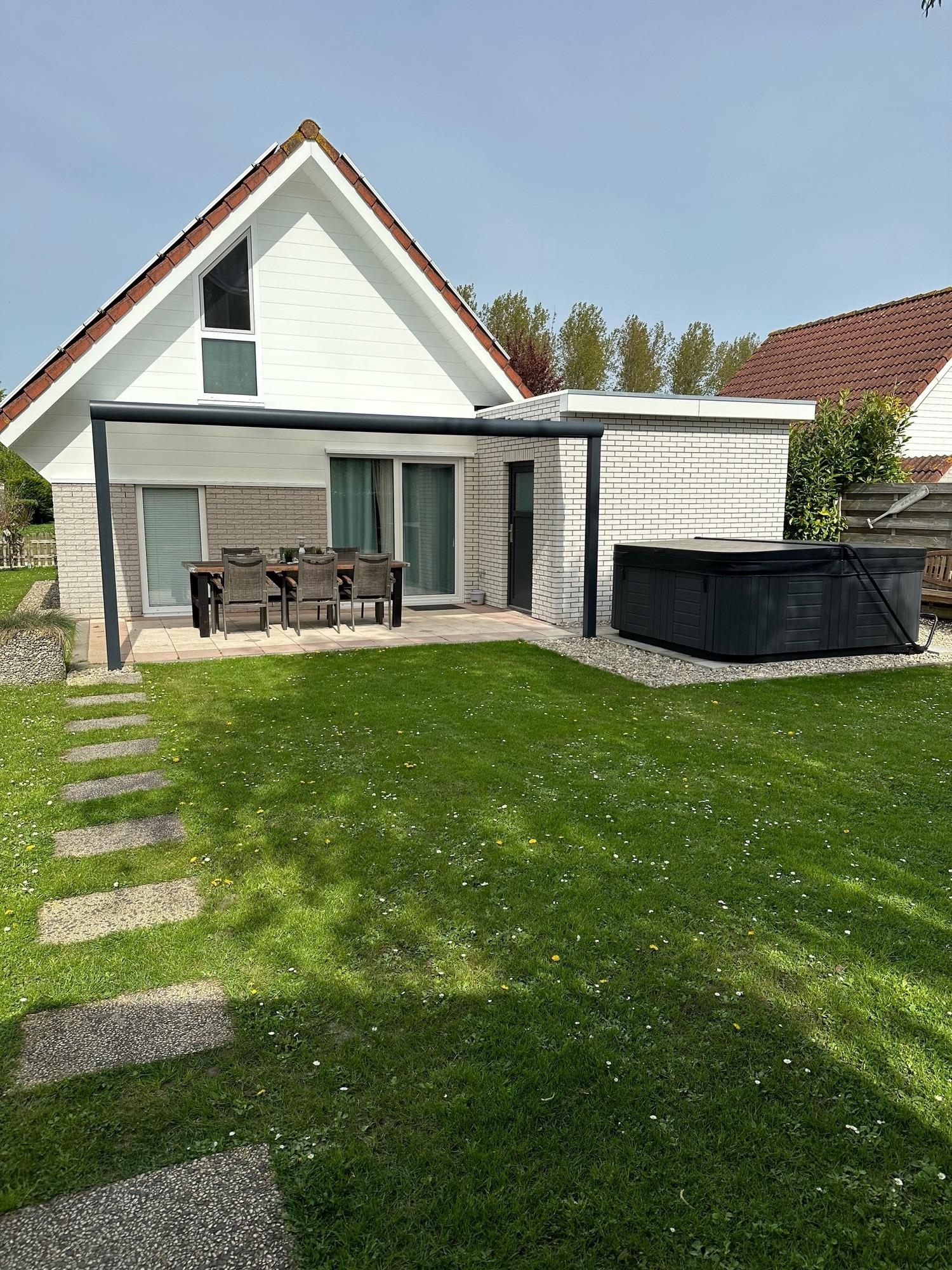 Im Garten gibt es verschiedene Sitzmöglichkeiten die zum Verweilen einladen. Gartenmöbel, Sonnenschirm und ein Grill runden das Angebot ab. Angrenzend an die überdachte Terrasse steht der große Jacuzzi.