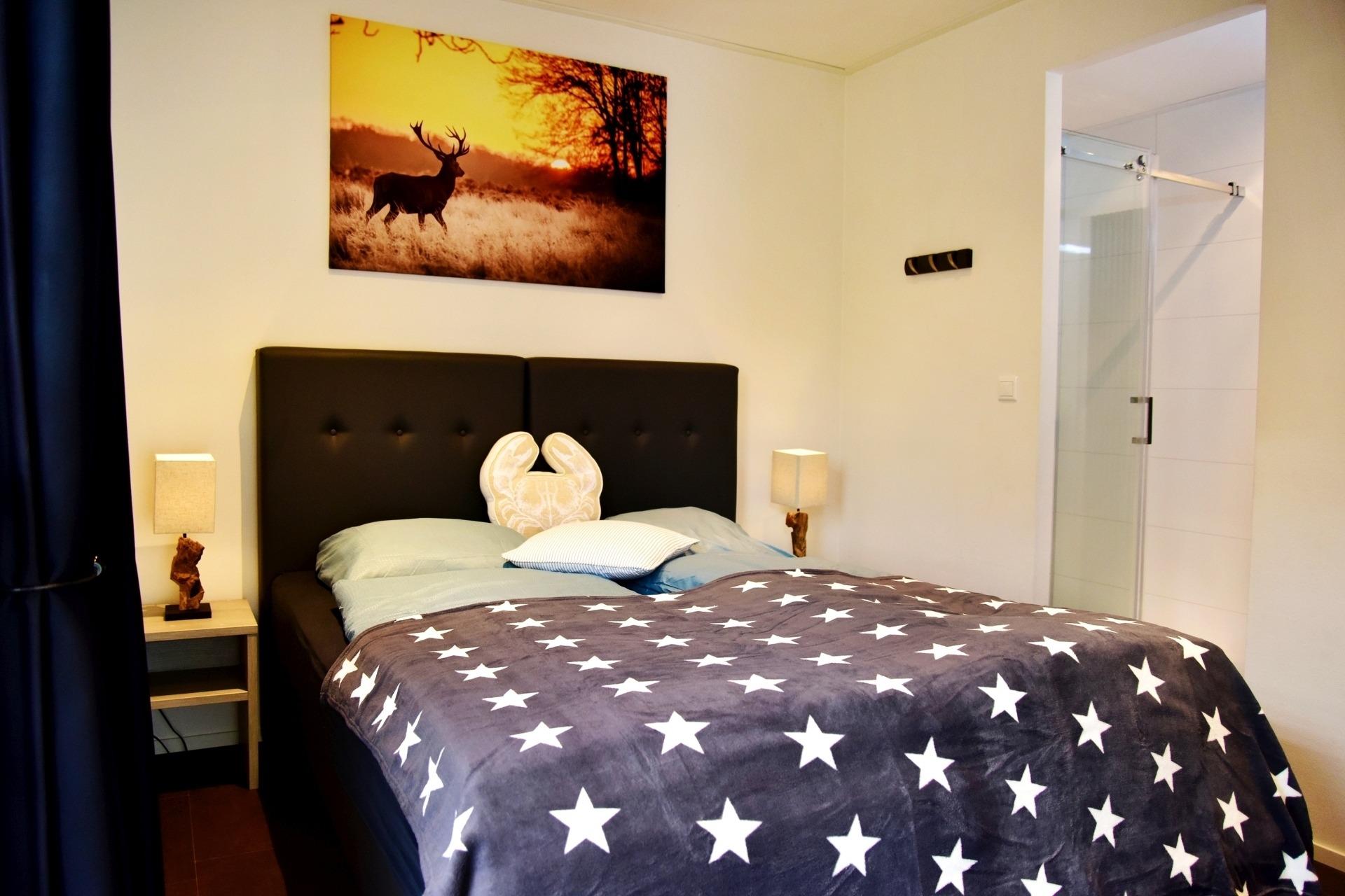 Im heimeligen Schlafzimmer mit Boxspringdoppelbett und direkten Zugang zum Bad und Ankleide, befindet sich ausserdem noch ein zweites Schlafzimmer auf der gegenüberliegenden Seite, ideal geeignet für Kinder (Etagenbett) oder Erwachsene, wo sich das zweite Badezimmer befindet. Über eine Treppe gelangt man dann zur Galerie, dort befindet sich das 3.Schlafzimmer - keine vollständige Stehhöhe (Kinder werden hier ihre Freude haben).