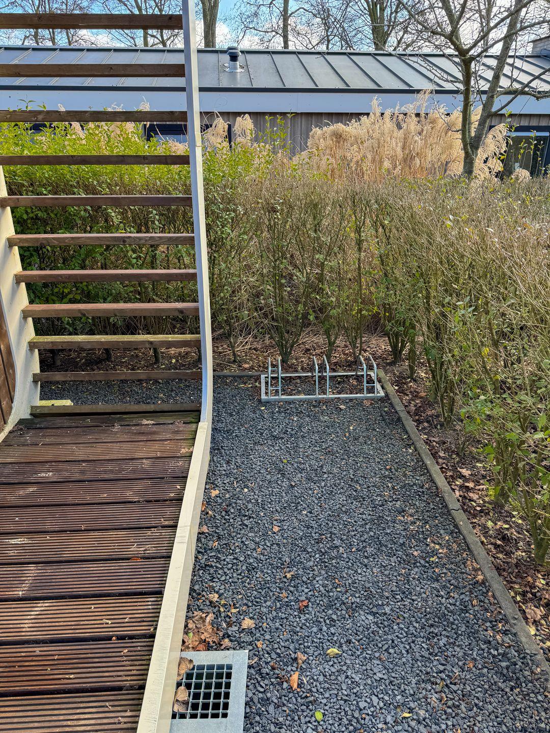 Dusche, Waschbecken und WC sowie Parkplatz direkt am Haus, Fahrradständer und Klimaanlage runden den Komfort ab.