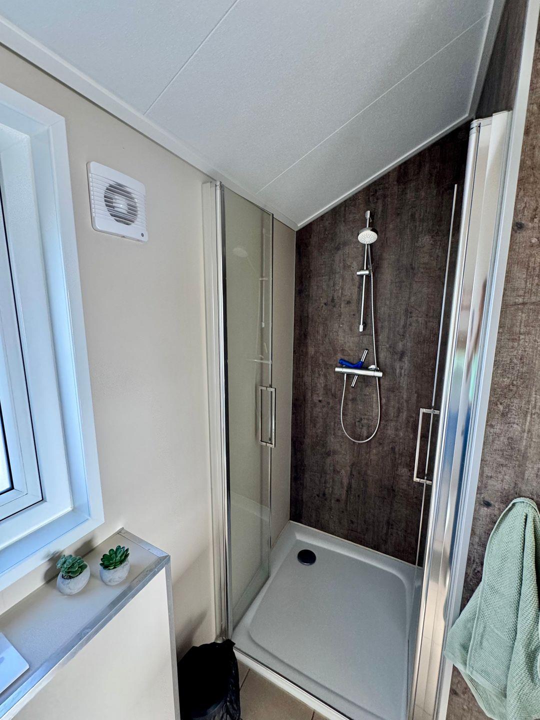 Das Chalet verfügt über ein Badezimmer mit einer bodengleichen Dusche, WC, Waschbecken, Spiegel und Fenster.