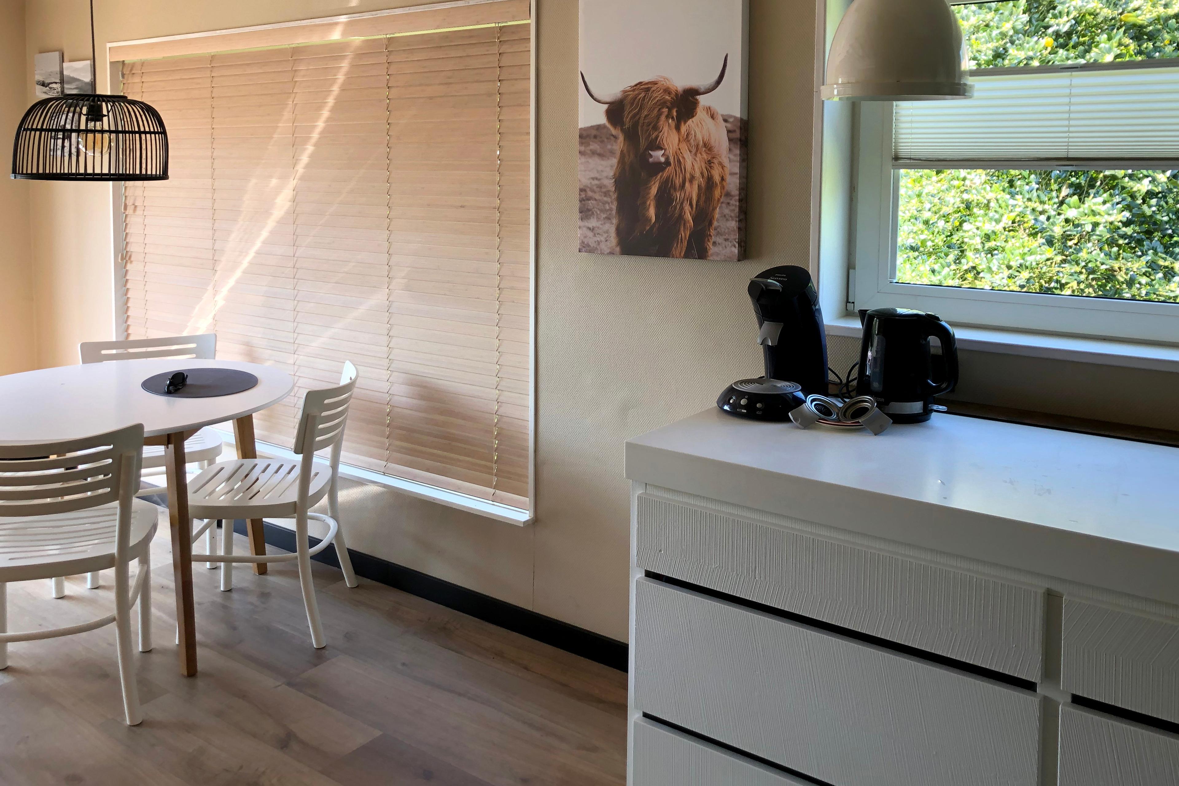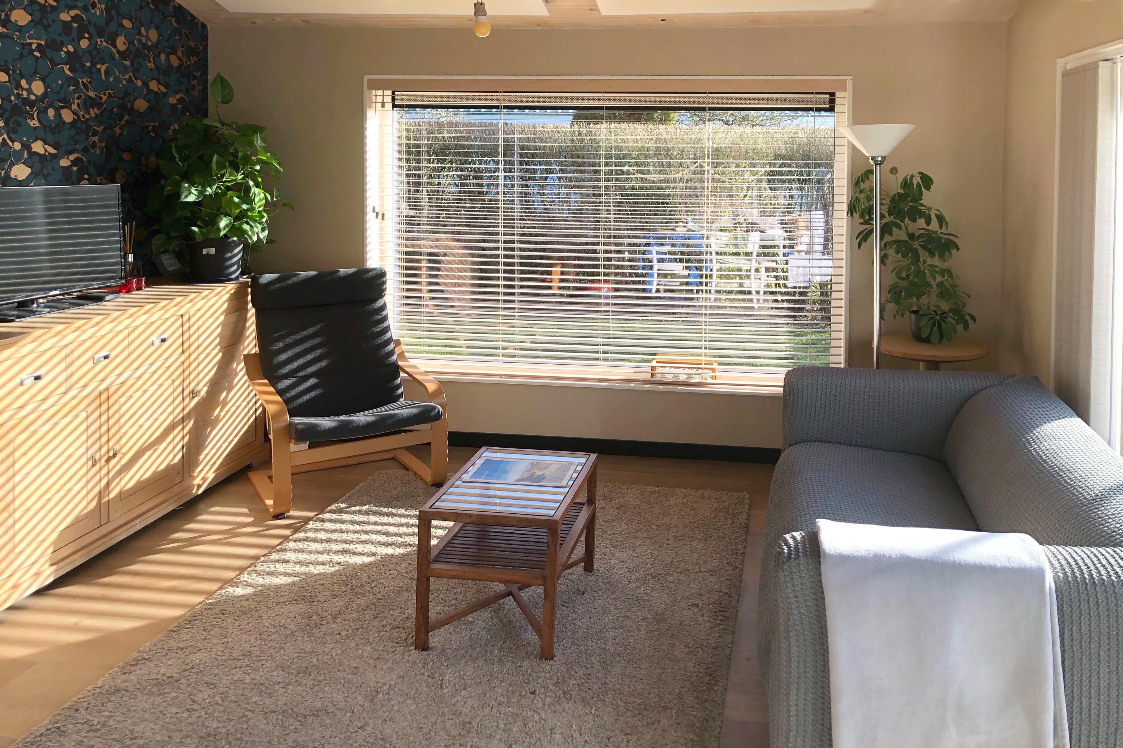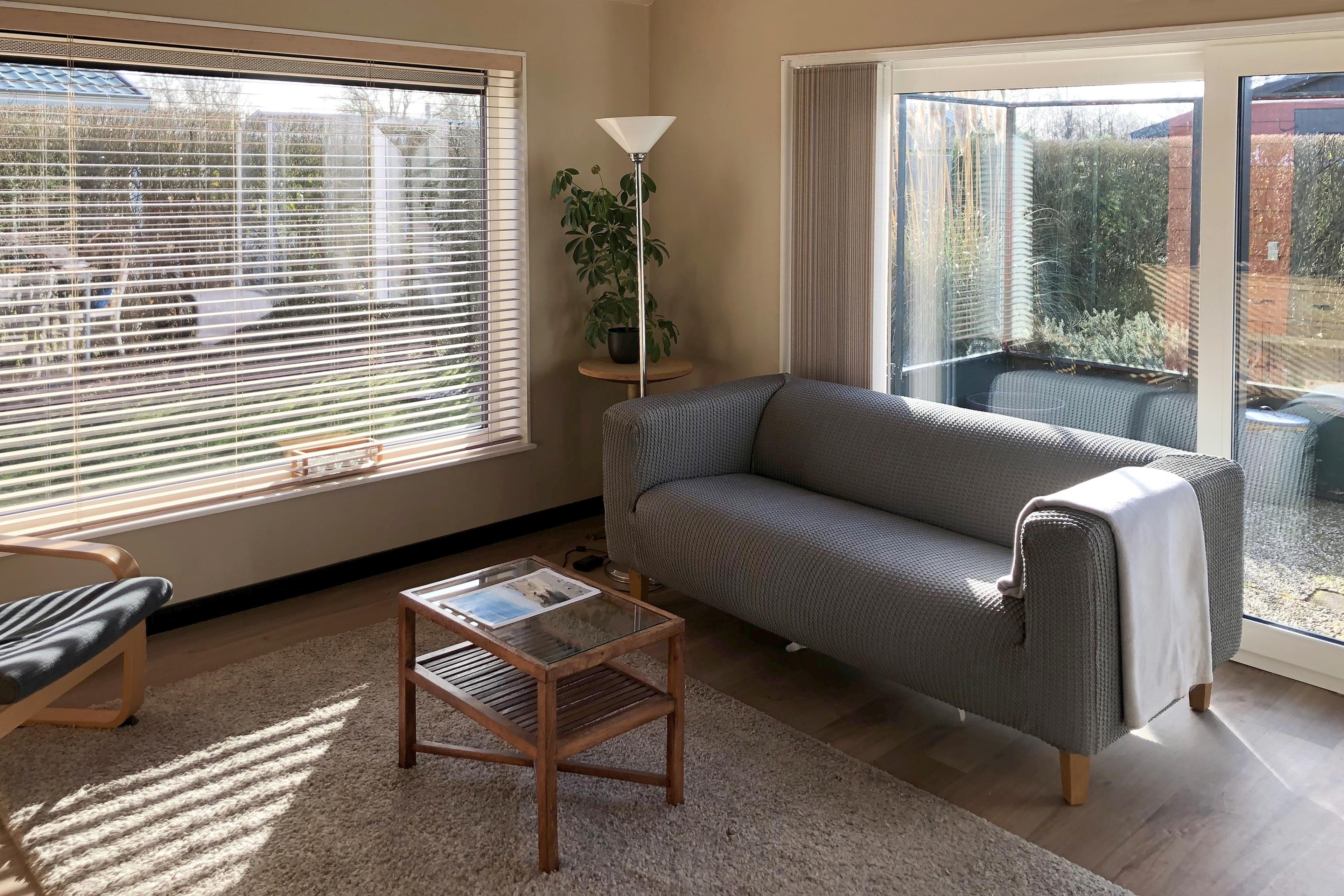 Das Ferienhaus SunGarden bietet mit seiner guten Ausstattung viel Komfort. Die Küche verfügt über eine Kombi-Mikrowelle und einen Geschirrspüler. Im Wohnzimmer steht ein Smart-TV, und die großen Fenster lassen viel Tageslicht herein.