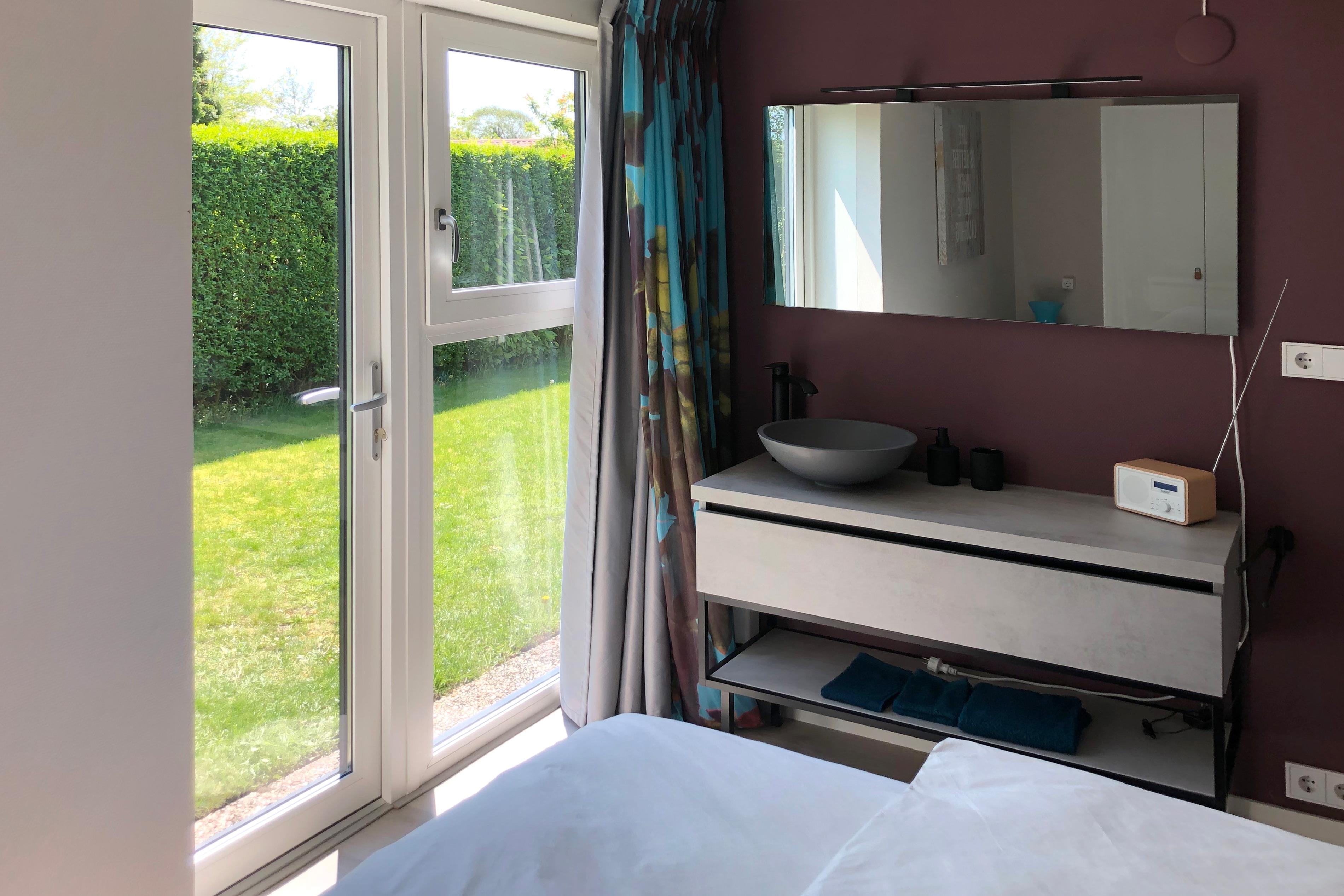 Es gibt zwei Schlafzimmer: eines mit einem Doppelbett und geräumigen Waschbecken, das andere mit einem Einzelbett. Das Badezimmer ist mit Waschbecken, Dusche und WC ausgestattet. Zudem steht Ihnen eine Waschmaschine zur Verfügung. Ihr Auto können Sie in der Nähe des Ferienhauses parken, und es gibt eine Ladestation im Ferienpark. Bringen Sie Ihre eigenen Fahrräder mit? Dann können Sie diese im Schuppen neben dem Ferienhaus abstellen.