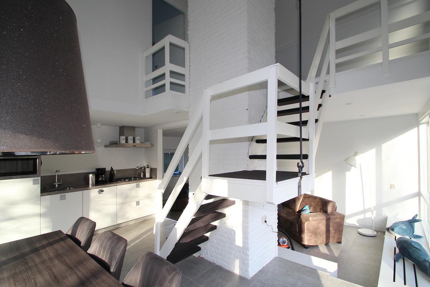 Eine offene Treppe führt in das Obergeschoss mit gemütlichen Schlafzimmern. Auf der obersten Etage gibt es zudem einen separaten Bereich mit einem Schlafsofa für eine Person.
