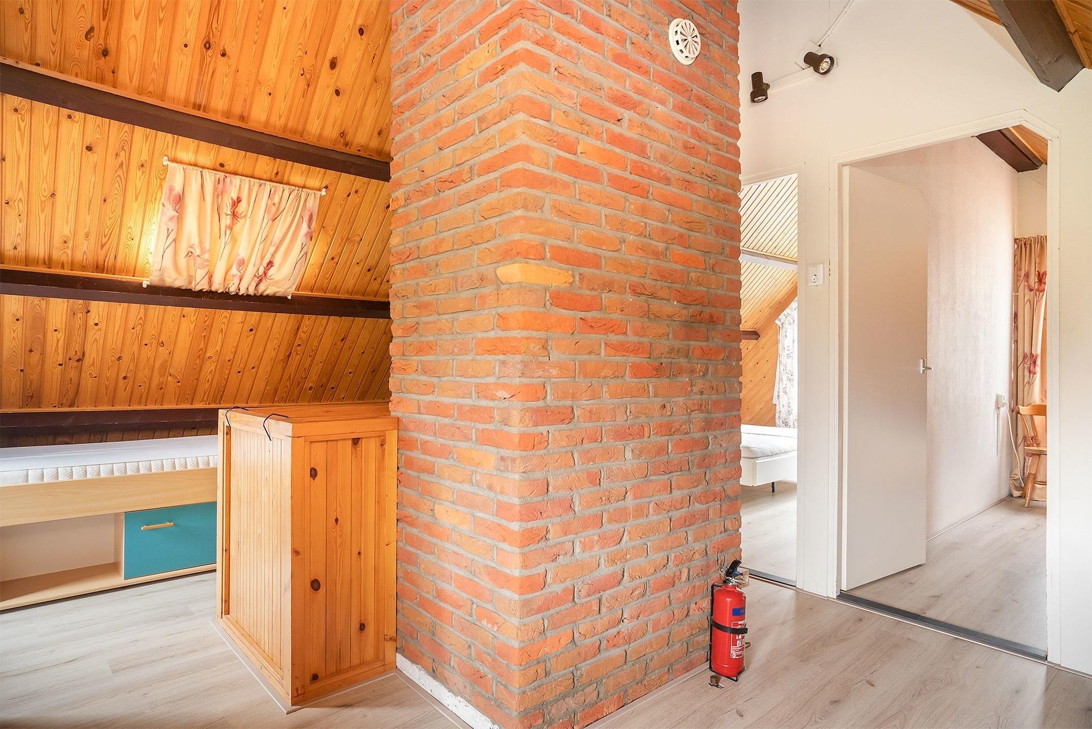 Im Obergeschoss befinden sich zwei weitere Schlafzimmer: eines mit Doppelbett und Schminktisch, das andere mit Einzel-Boxspringbett und Kommode. Auf dem Flur stehen zusätzlich zwei Einzelbetten, eines davon mit praktischen Schubladen. Ein Kinderbett mit Matratze und Bettwäsche ist ebenfalls verfügbar. Für heiße Sommertage sorgt ein Ventilator für Abkühlung.
