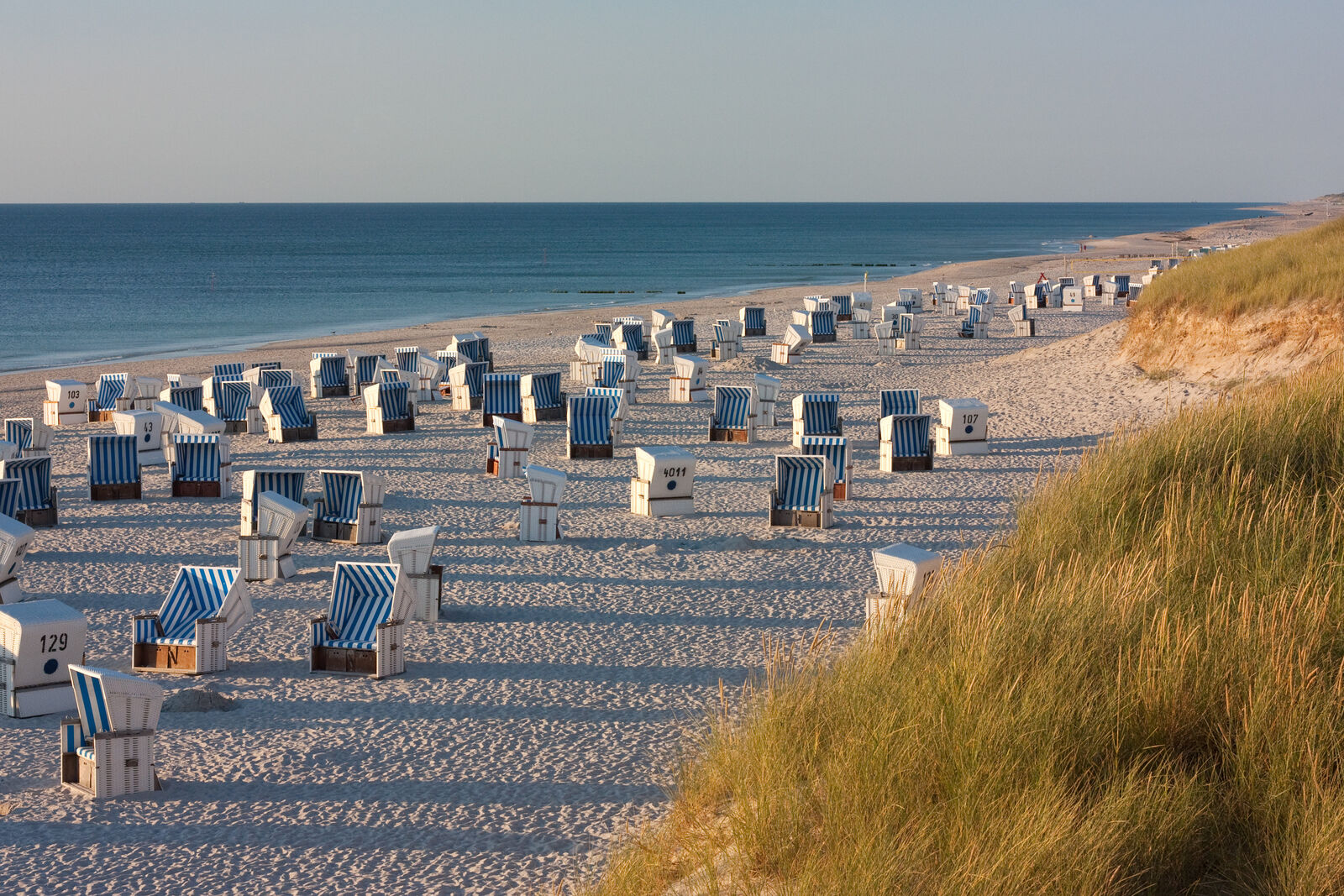 Strandkörbe stehen in ausgewählten Bereichen zur Verfügung und bieten Schutz vor Wind und Sonne. Öffentliche Einrichtungen sind bewusst dezent gehalten, damit der Strand seinen natürlichen Charakter behält.